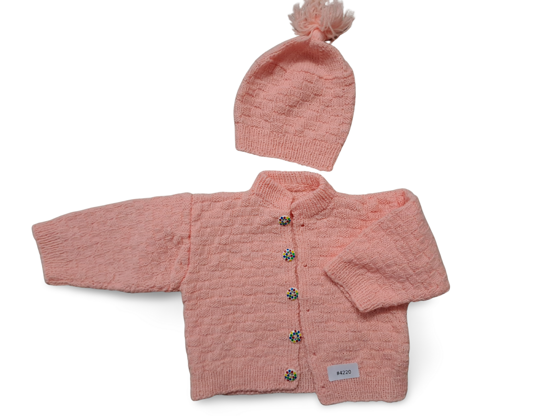 Susses Strickset in zartem Rosa mit liebevollen, bunten Knöpfen. Die feine Strickjacke und die passende Mütze mit Bommel umarmen kleine Abenteuer mit anschmiegsamer Wärme und zarter Textur, perfekt für kuschelige Spaziergänge und verspielte Tage.