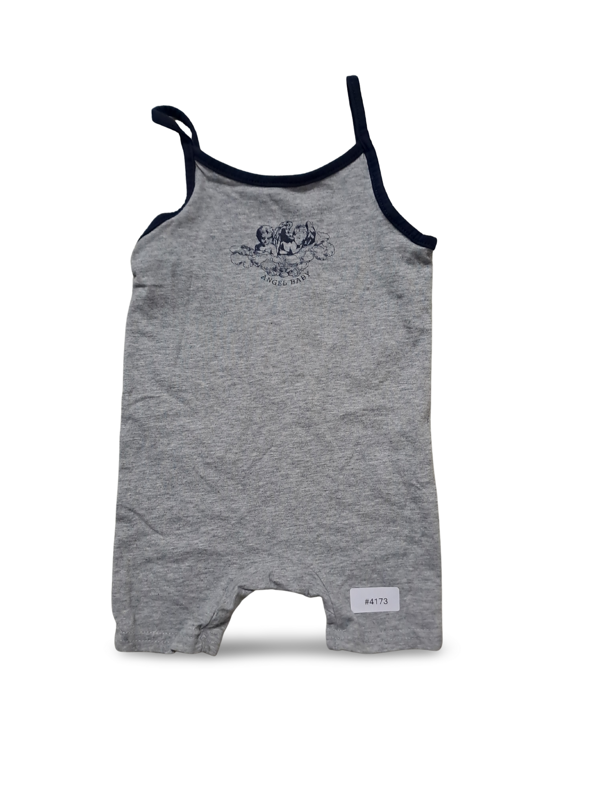 Zarter, freundlicher Baby-Strampler in sanftem Grau mit dunkelblauen Saumabschlüssen und einem kleinen Engelsmotiv auf der Brust. Das anschmiegsame Material fühlt sich weich an und umhüllt das Baby mit liebevoller Geborgenheit, ideal für warme Tage und kuschelige Stunden.