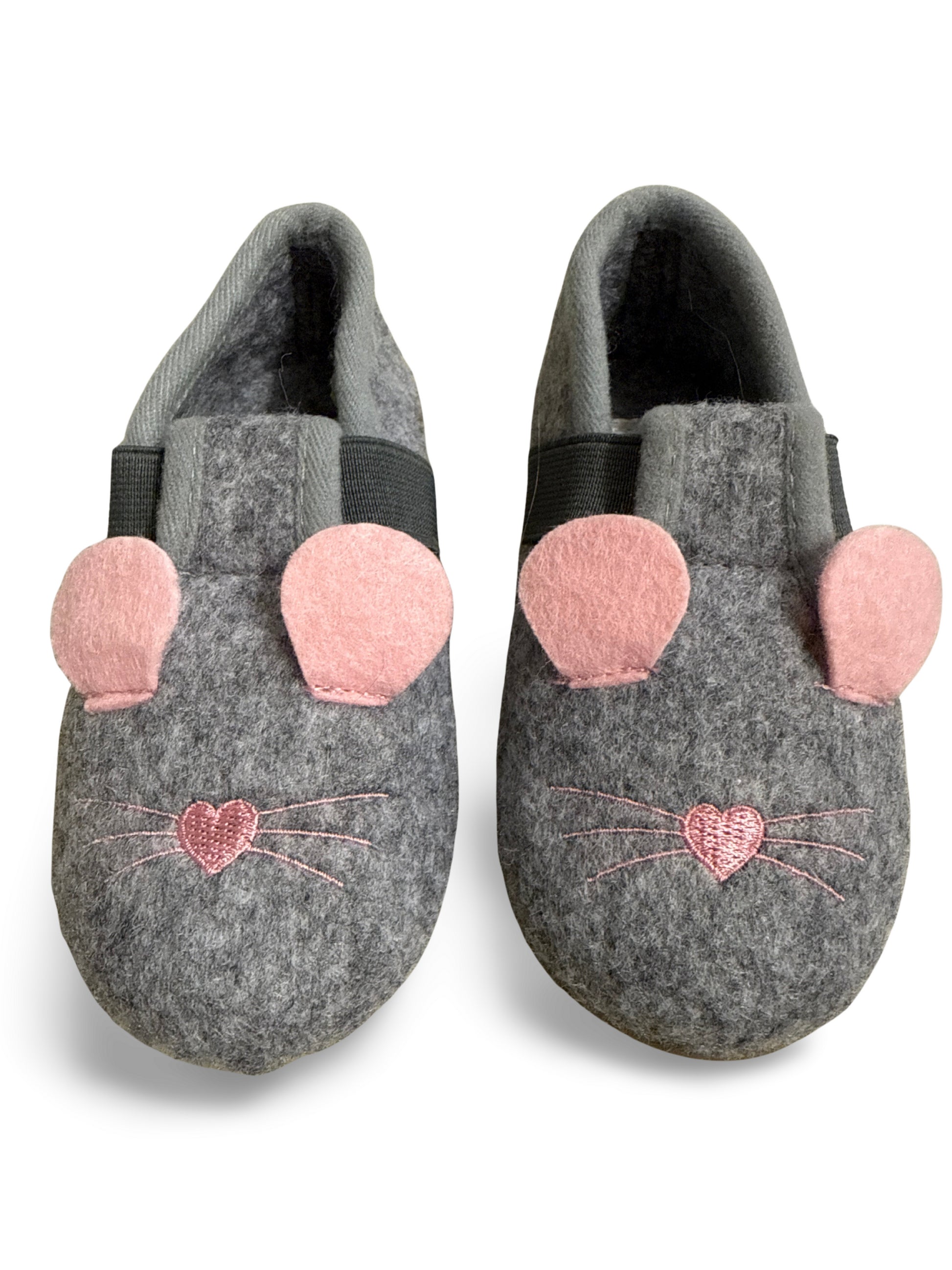 Gemütliche Filz-Hausschuhe in Grau mit rosa Ohren und einer aufgestickten Herz-Nase – ein verspieltes Maus-Design. Mit elastischem Einsatz am Spann für einfaches Anziehen und weichem Futter für angenehmen Tragekomfort. Perfekt für entspannte Stunden zuhause.
