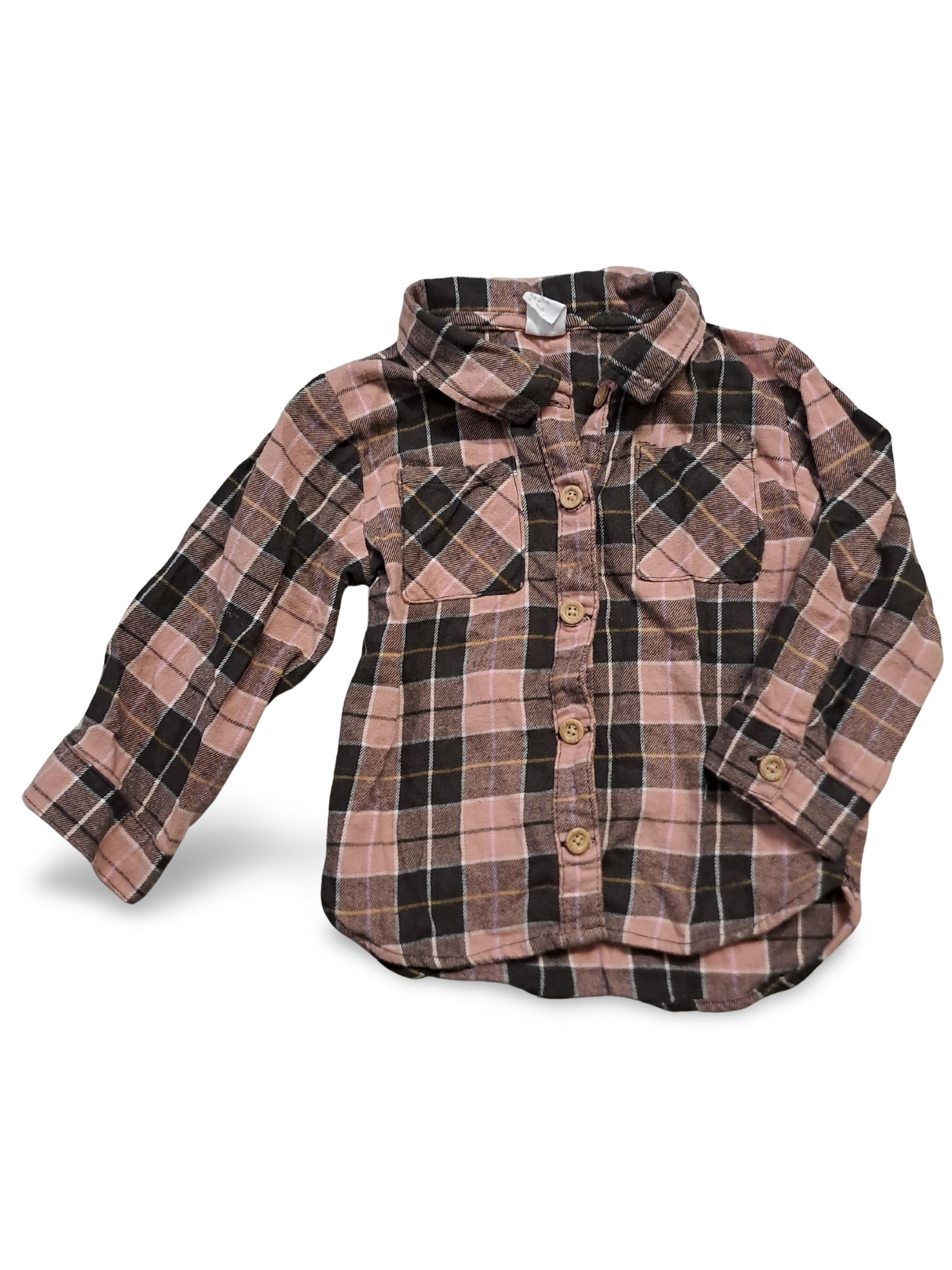 Karriertes Flanellhemd in Rosa mit dunkelbraunen und schwarzen Akzenten, ausgestattet mit Holzknöpfen und zwei Brusttaschen. Der klassische Schnitt mit Kragen und langen Ärmeln ist vielseitig kombinierbar und verleiht einen lässigen Look.