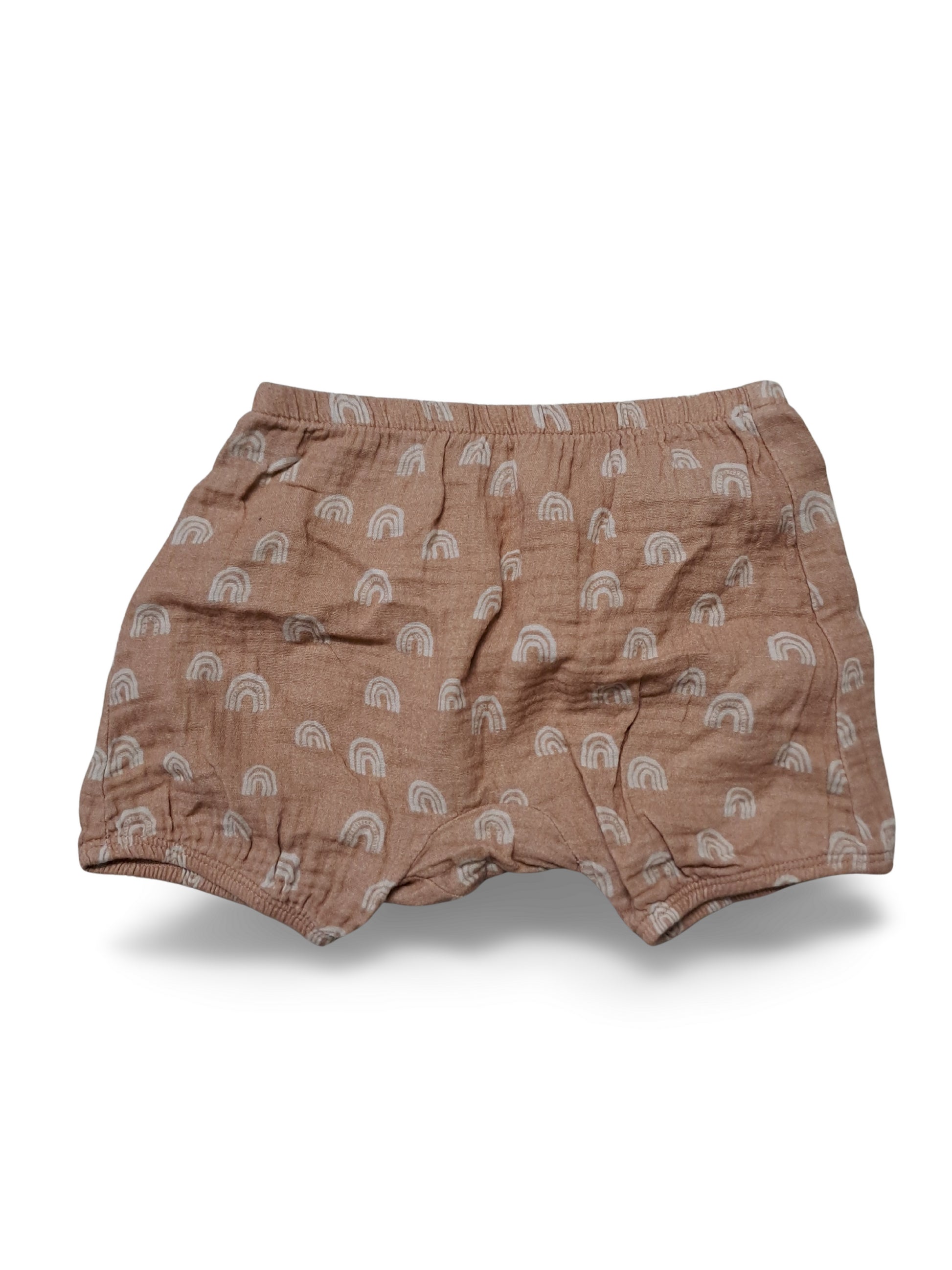 Luftige Shorts im zarten Roséton mit weissen Regenbogenmotiven. Der elastische Bund ermöglicht einfaches An- und Ausziehen. Ein lässiges Teil für warme Sommertage.
