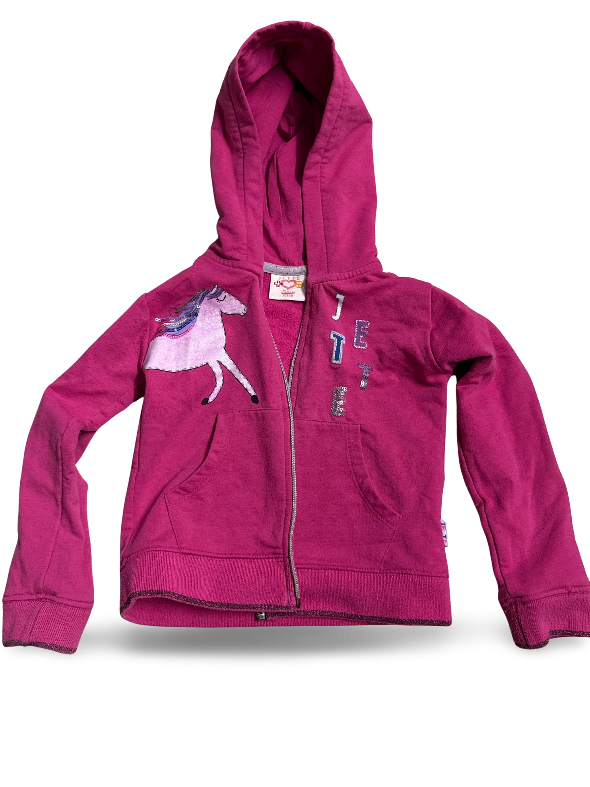 Kräftig pinke Kapuzenjacke mit durchgehendem Reissverschluss und praktischen Kängurutaschen. Auf der Vorderseite ein verspieltes Einhornmotiv mit dezenten Glitzer- und Applikationsdetails. Ein lässiges Teil für Alltag und Freizeit.