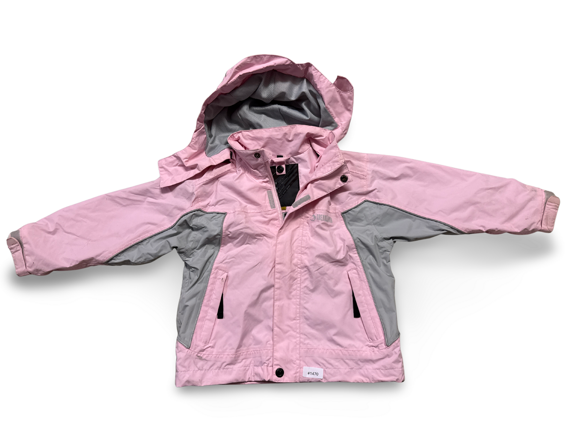 Kinderjacke mit Kapuze, gefüttert und wasserabweisend, mit Reissverschlüssen an den Taschen, verstellbarer Ärmellänge und schönen Details.