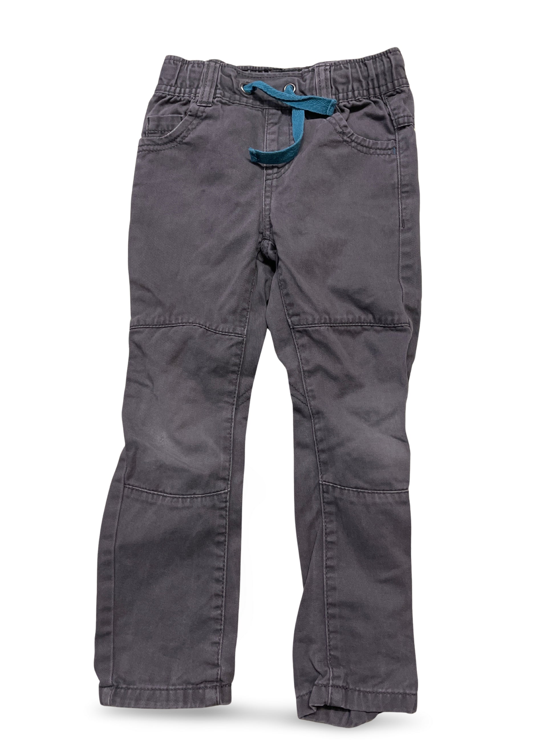 Graue Kinderhose mit elastischem Bund und türkisem Kordelzug für einfaches An- und Ausziehen. Zwei seitliche Eingriffstaschen und verstärkte Kniepartien für zusätzliche Funktionalität. Gerades Bein, vielseitig kombinierbar.