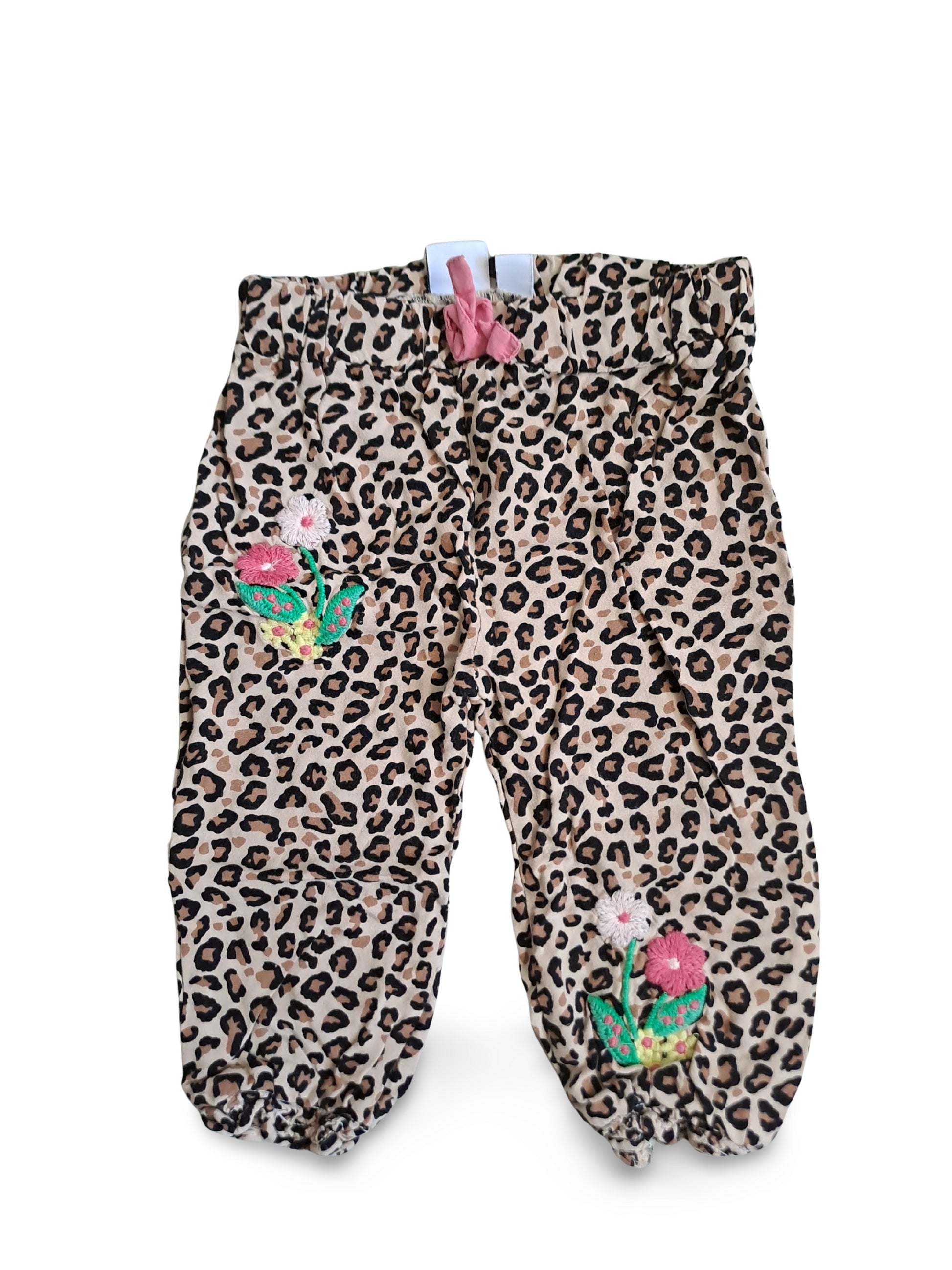 Leopardenmusterte Kinderhose mit fröhlichen, bunten Blumen-Applikationen. Elastischer Bund mit rosa Zierkordel und elastische Beinabschlüsse für einen bequemen Sitz.