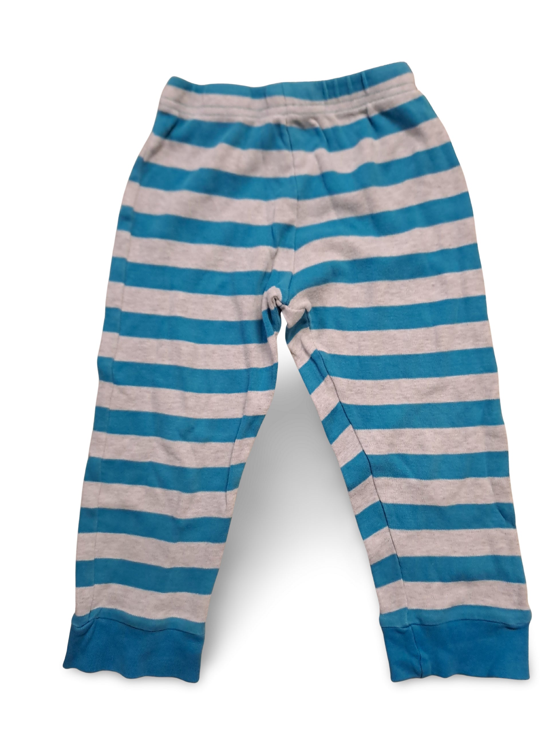 Bequeme Kinderhose mit horizontalen Streifen in Türkis und Hellgrau, ideal als Schlaf- oder Freizeit-Hose. Der elastische Bund und die Bündchen am Saum sorgen für einen guten Sitz.