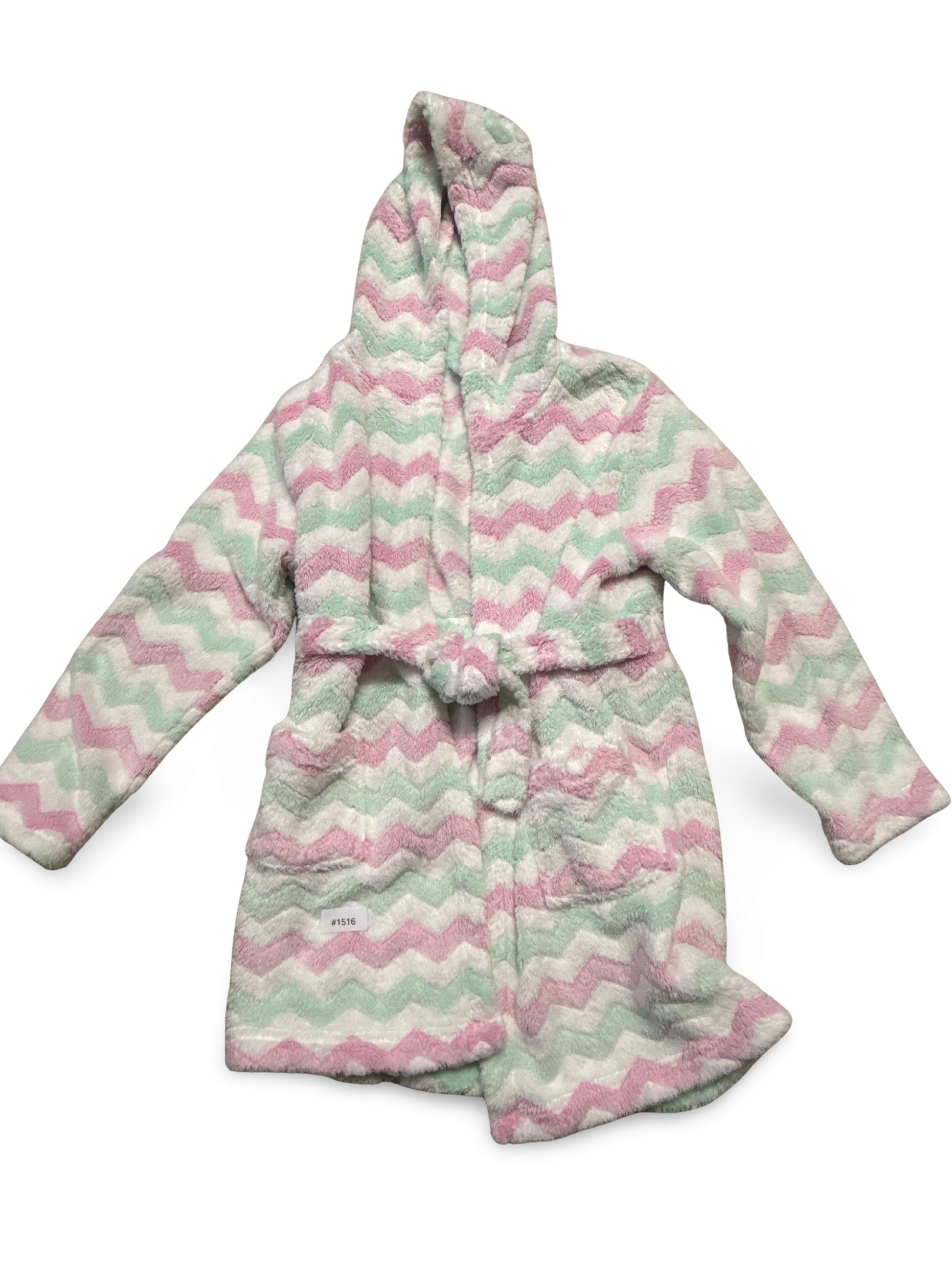 Weicher Kapuzenbademantel, lässig geschnitten, mit pastellfarbenem Zickzackmuster, schön gefüttert und mit Gürtel sowie Taschen