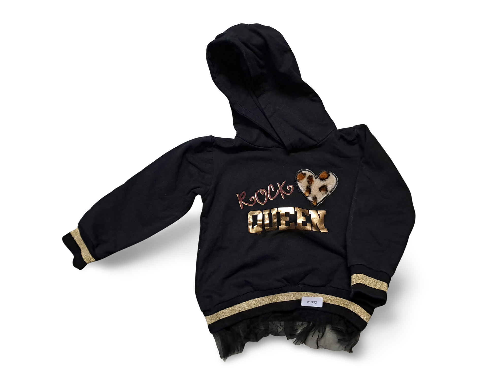 Kinderkapuzenpullover mit langen Ärmeln, auf der Vorderseite goldener Schrift 'QUEEN', Leopardherz-Applikation, goldene Bündchen und Tüllsaum