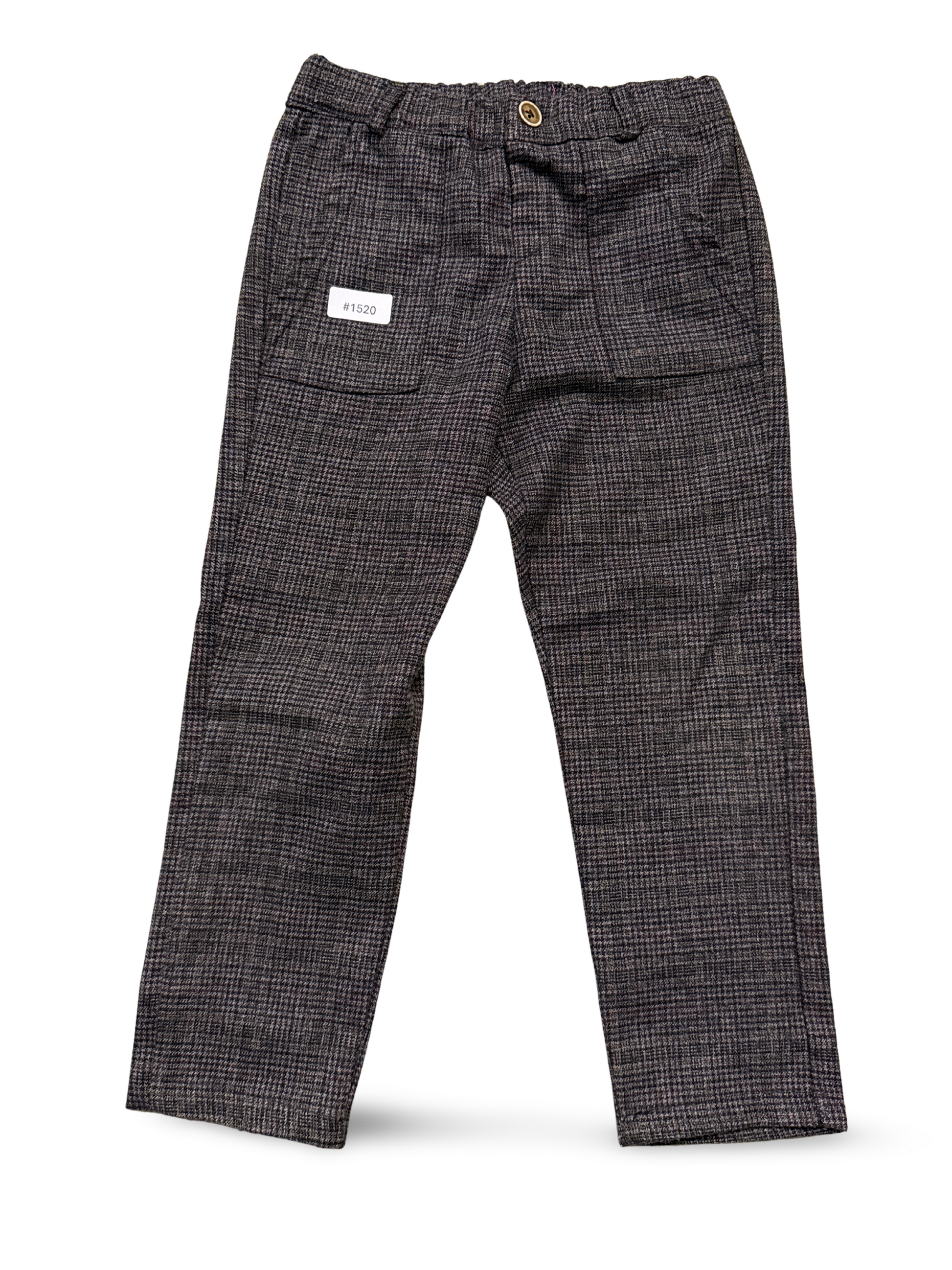 Laessige Kinderhose mit elastischem Bund, Knopfverschluss, kariertem Muster und aufgesetzten Taschen.