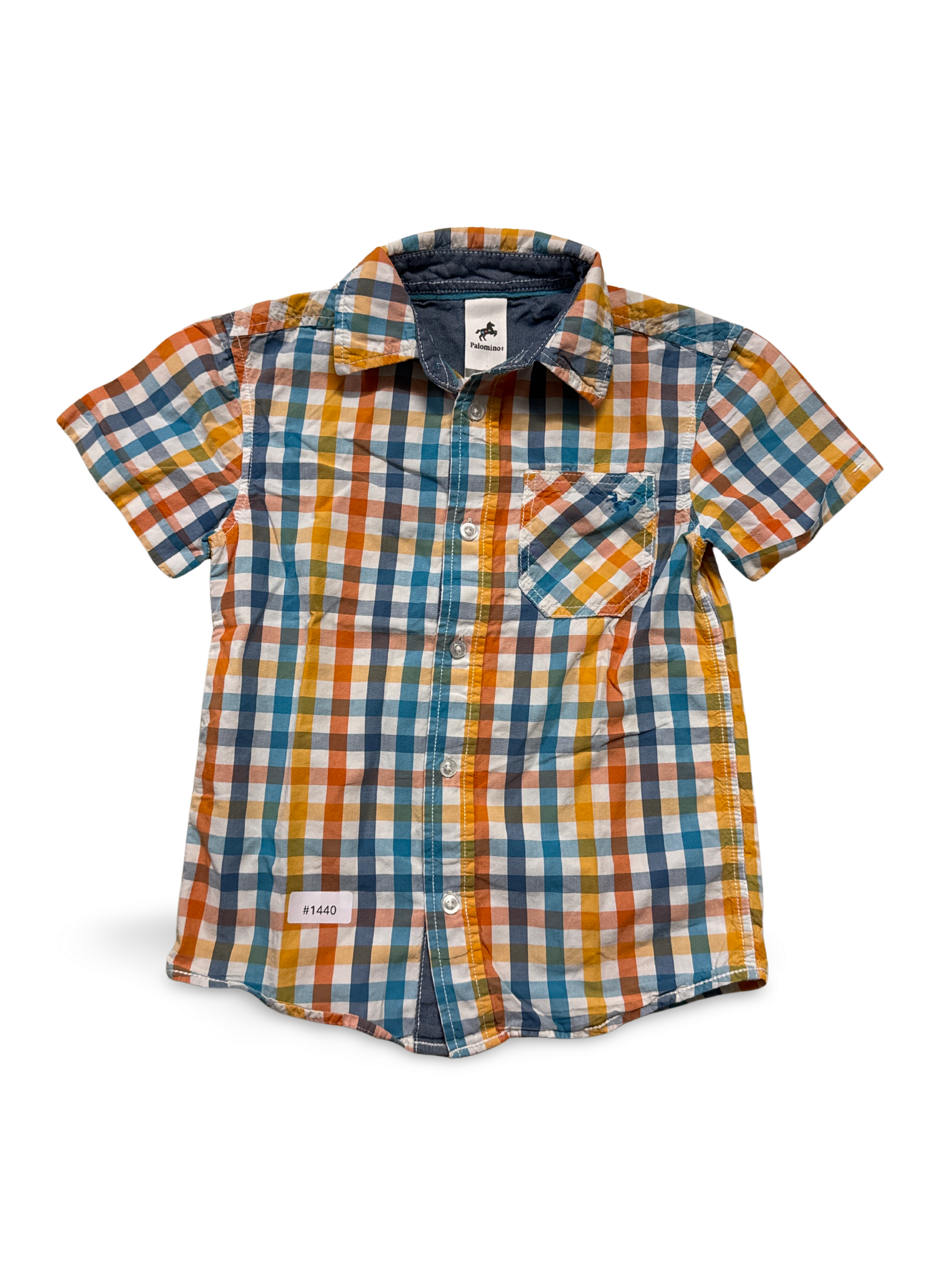 Kariertes Kurzarmhemd aus Baumwolle, lässig und luftig, leichte Gebrauchsspuren am Saum, mit Knopfleiste und Brusttasche. Ideal für warme Tage.