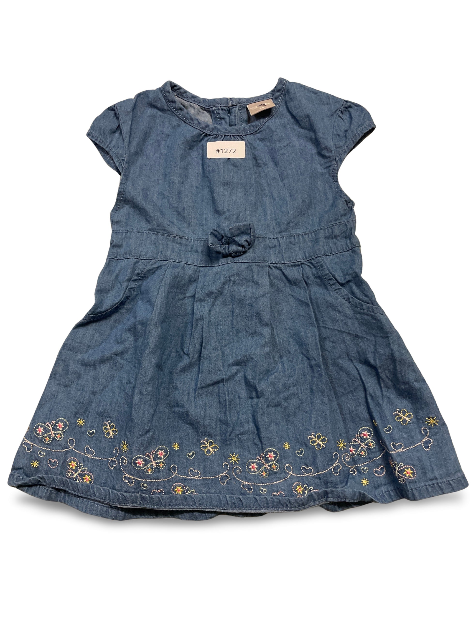 Ein süsses blaues Kleid mit kurzen Ärmeln und bunten Stickereien am Saum.