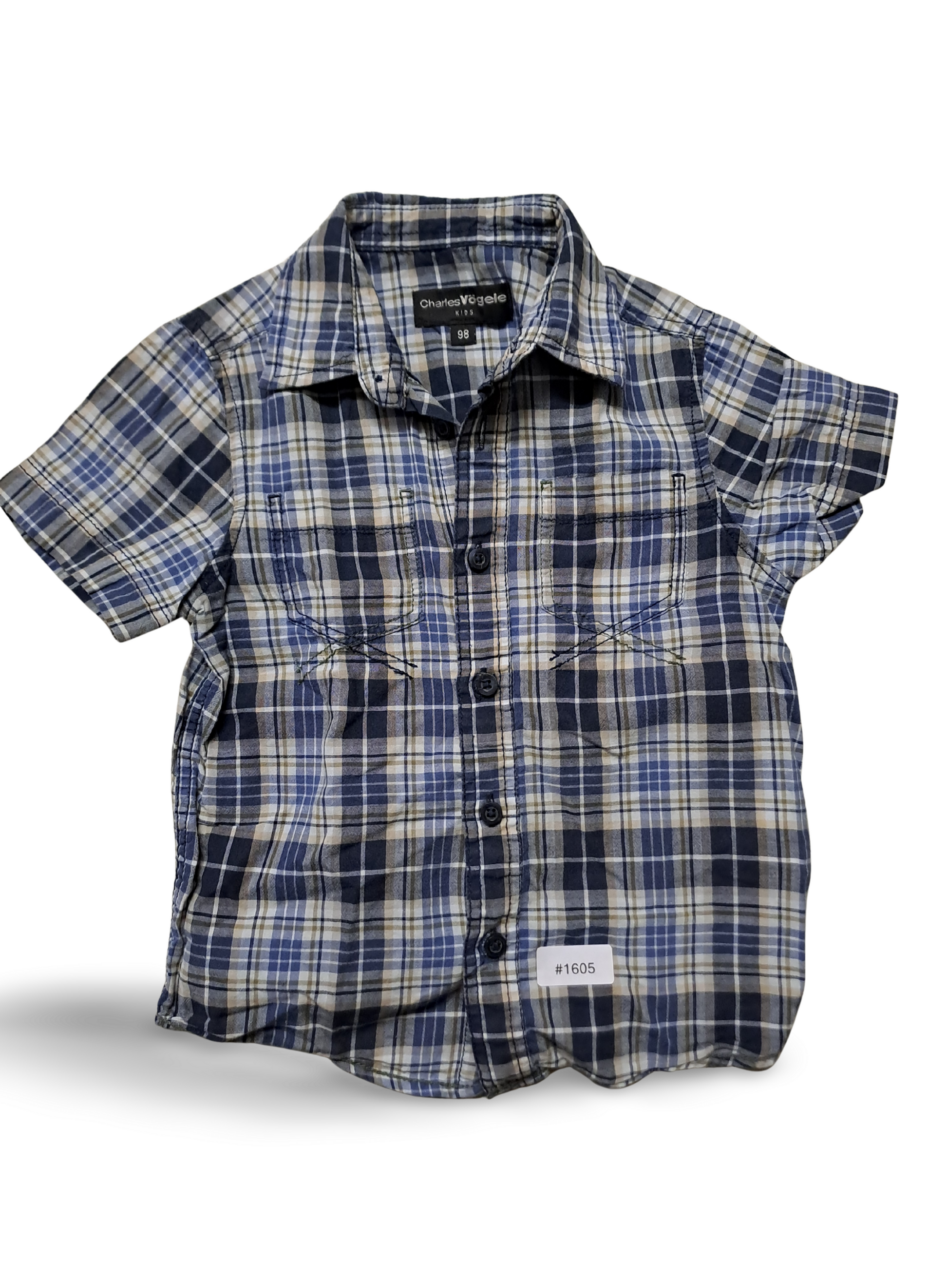 Kariertes Kurzarmhemd für Kinder mit Kragen, durchgehender Knopfleiste, zwei aufgesetzten Brusttaschen, Knöpfen und kurzen Ärmeln. Grösse 98.