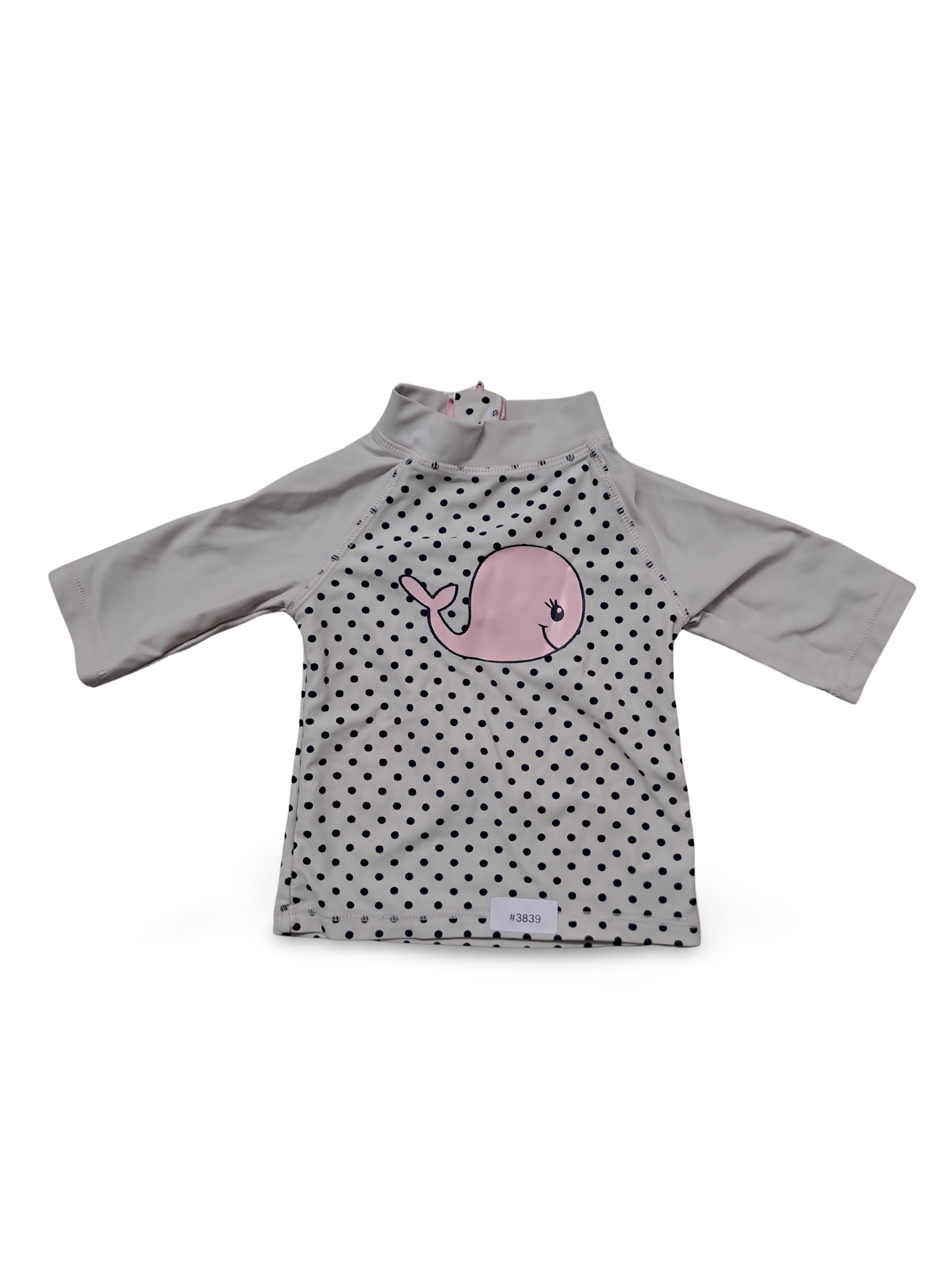 Ein suesses und froehliches Badeoberteil fuer kleine Entdeckerinnen. Zartes Weiss mit schwarzen Punkten und einem niedlichen rosa Walmotiv verleiht Sommerfreude und gute Laune am Strand oder im Schwimmbad.
