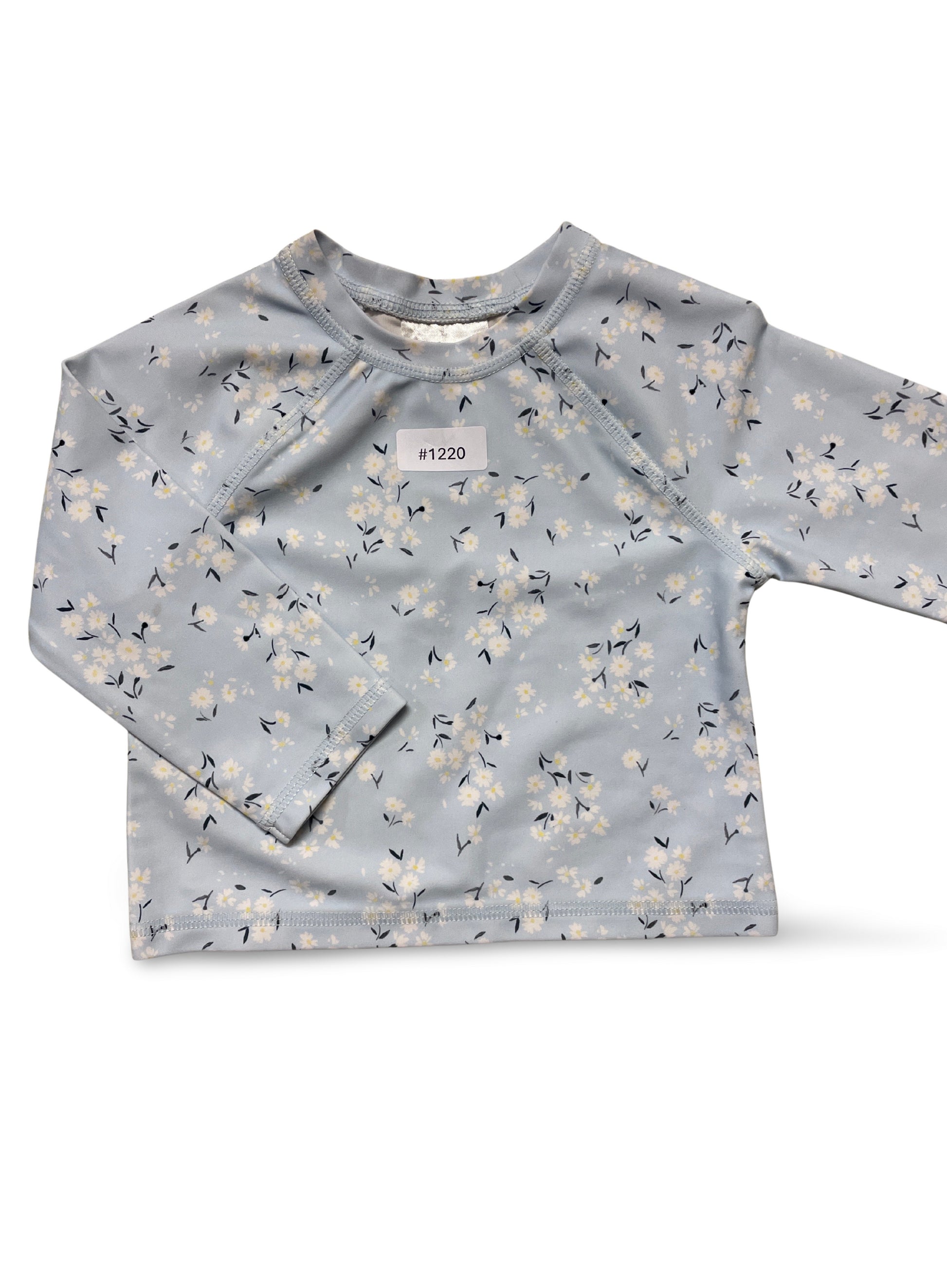Ein süsses Badeshirt mit floralem Muster in Blau und Weiss.