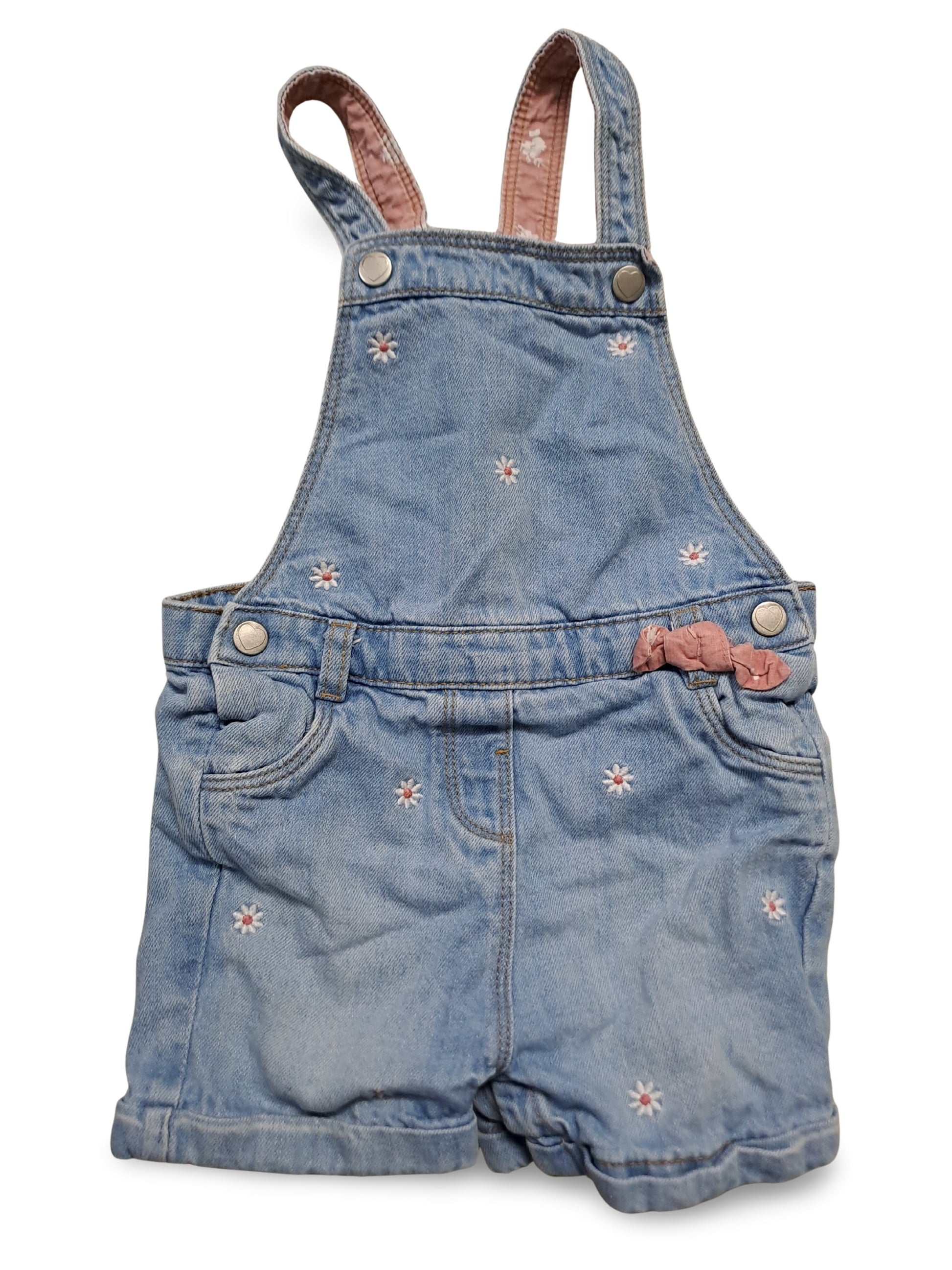 Jeans-Latzshorts in hellem Denim mit zarten weissen Blütenstickereien und einer kleinen rosa Schleife. Mit verstellbaren Trägern und praktischen Seitentaschen. Perfekt als sommerliches, lässiges Outfit für Kinder.
