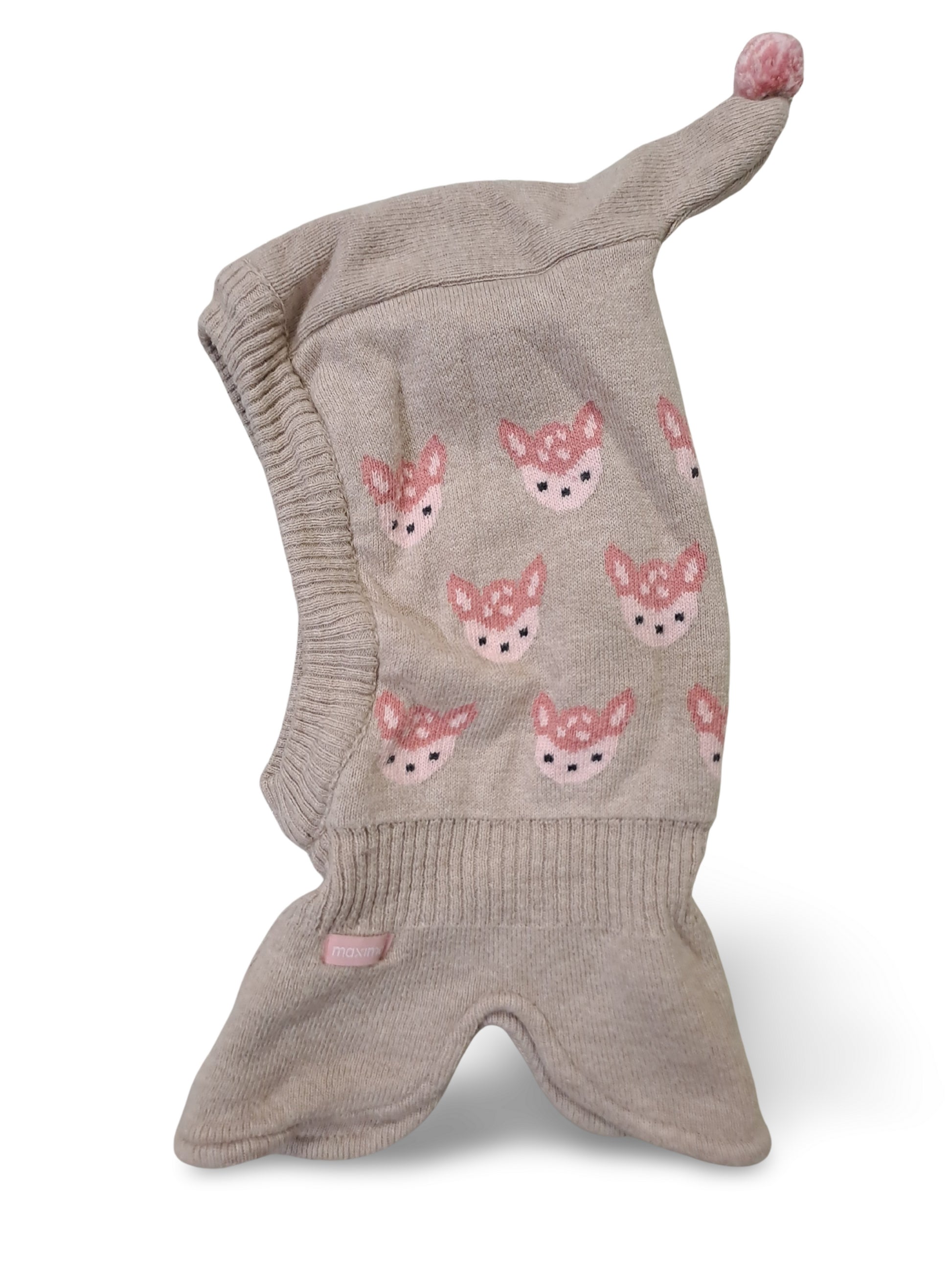 Gestrickte Schlupfmütze in warmem Beige mit pinkem Bommel oben und mehreren süssen Rehgesichtern in Rosatönen. Die anschmiegsame Form schützt Hals und Kopf und ergänzt jedes winterliche Outfit auf verspielte Art.