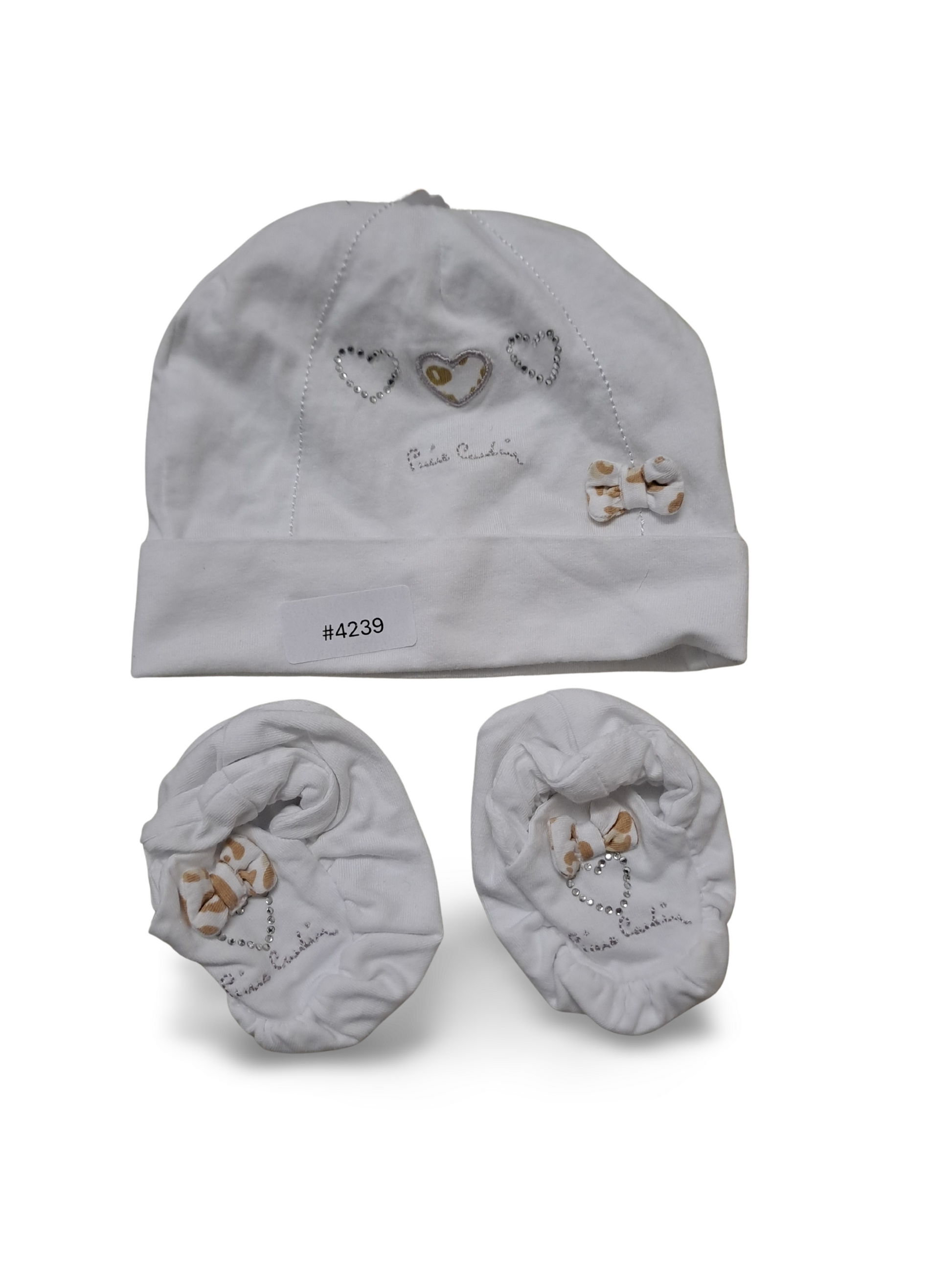Ein entzueckendes Babyset mit weicher Mütze und passenden Fäustlingen, liebevoll verziert mit kleinen Herzchen, funkelnden Strasssteinchen und niedlichen Schleifchen. Ideal für zarte Babyhaut und als zauberhafter Hingucker an jedem Tag.