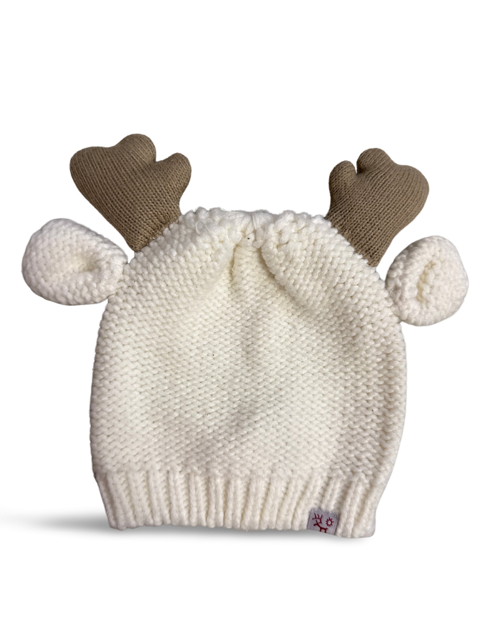 Gestrickte, cremeweisse Kindermütze mit zwei beigen Geweihen und niedlichen Öhrchen für einen verspielten Winterlook. Das weiche Strickmuster wirkt kuschelig und passt toll zu warmen Outfits.
