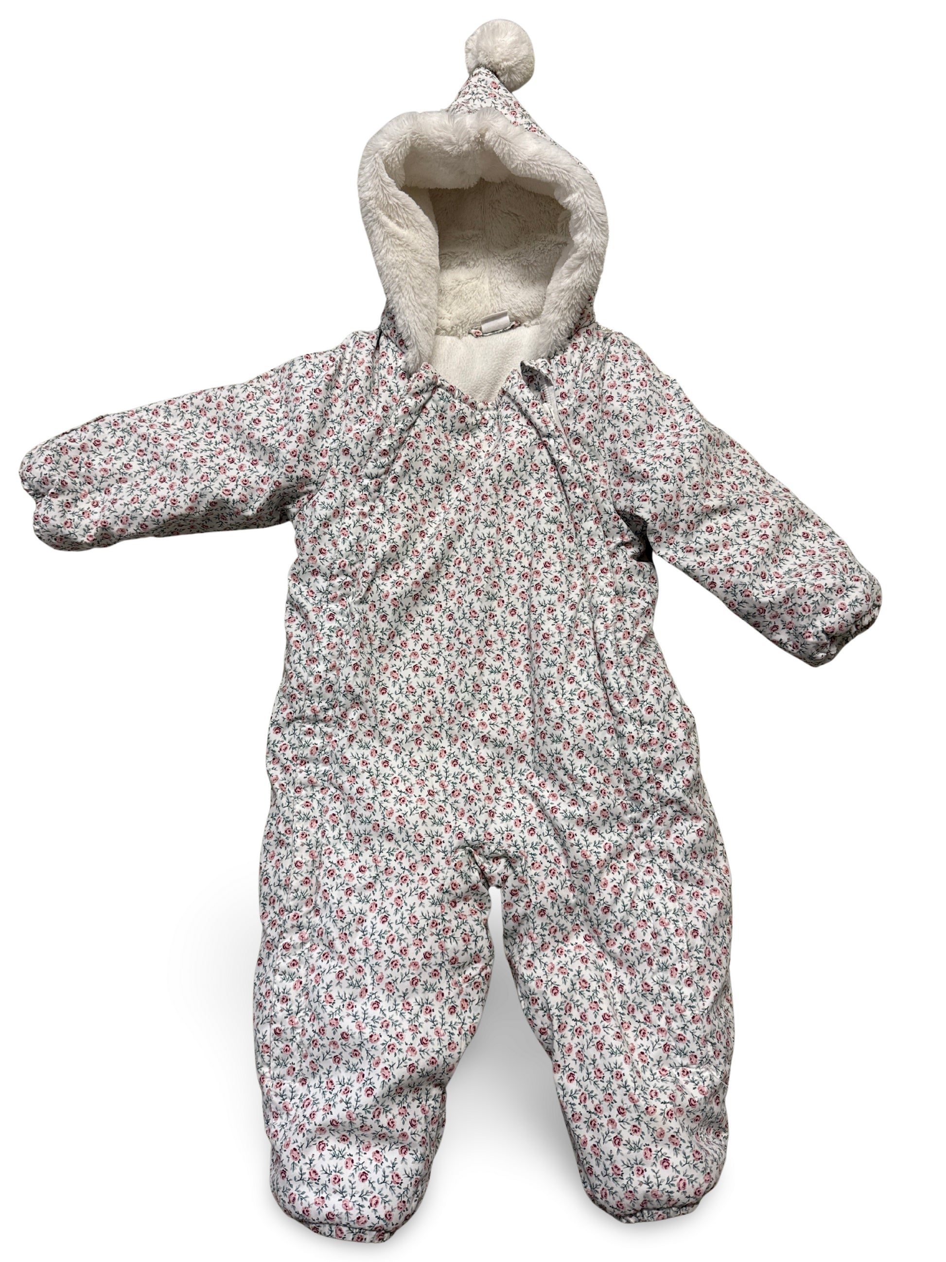 Warmer Overall mit Kapuze und Blumenmuster, ideal für kalte Tage.