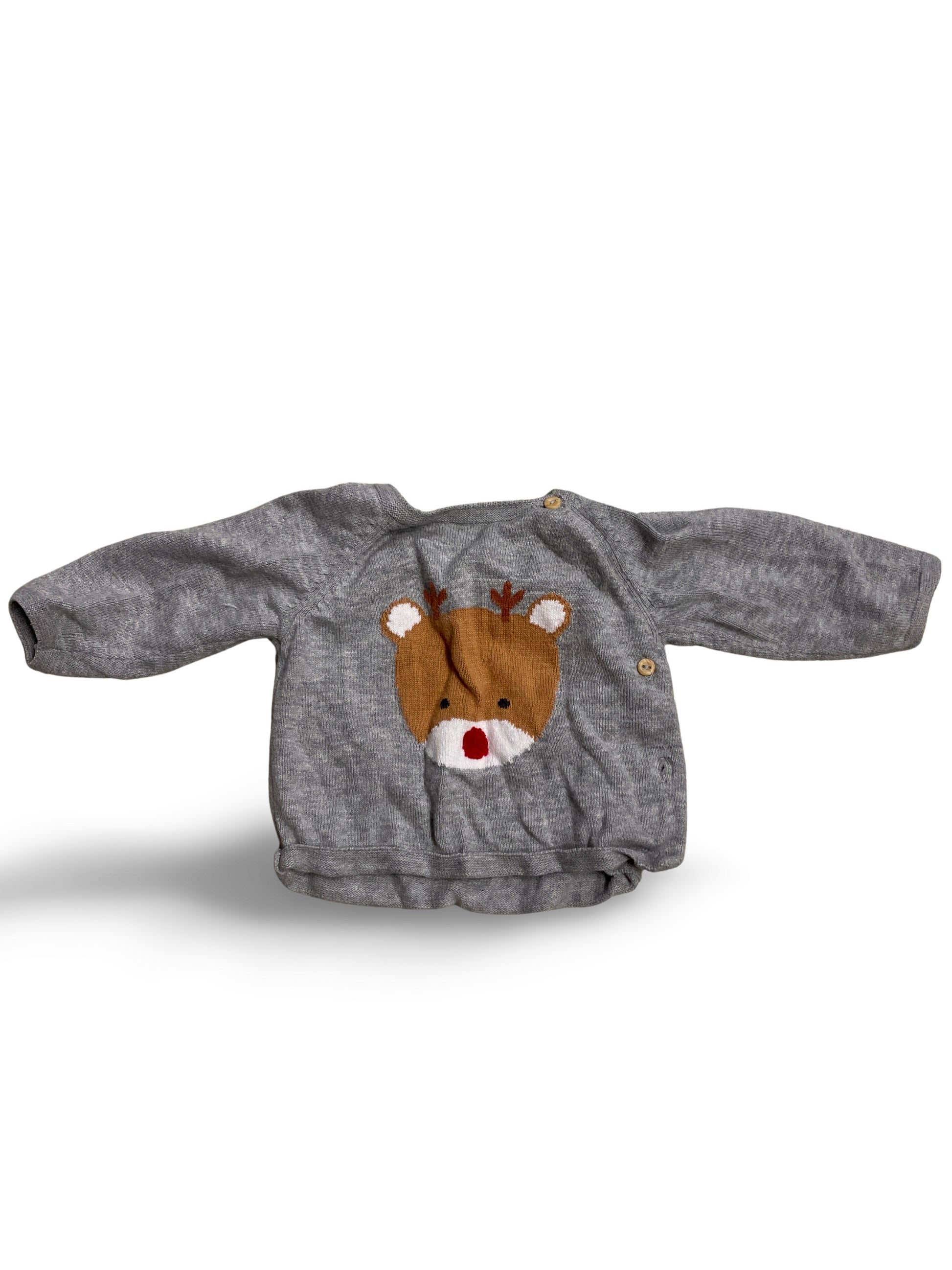 Grauer Strickpullover für Babys mit niedlichem Rentiermotiv auf der Vorderseite. Mit langen Ärmeln und praktischer Knopföffnung an Schulter und Seite für einfaches An- und Ausziehen. Feine Strickoptik und schlichtes Design, ideal für den Alltag.