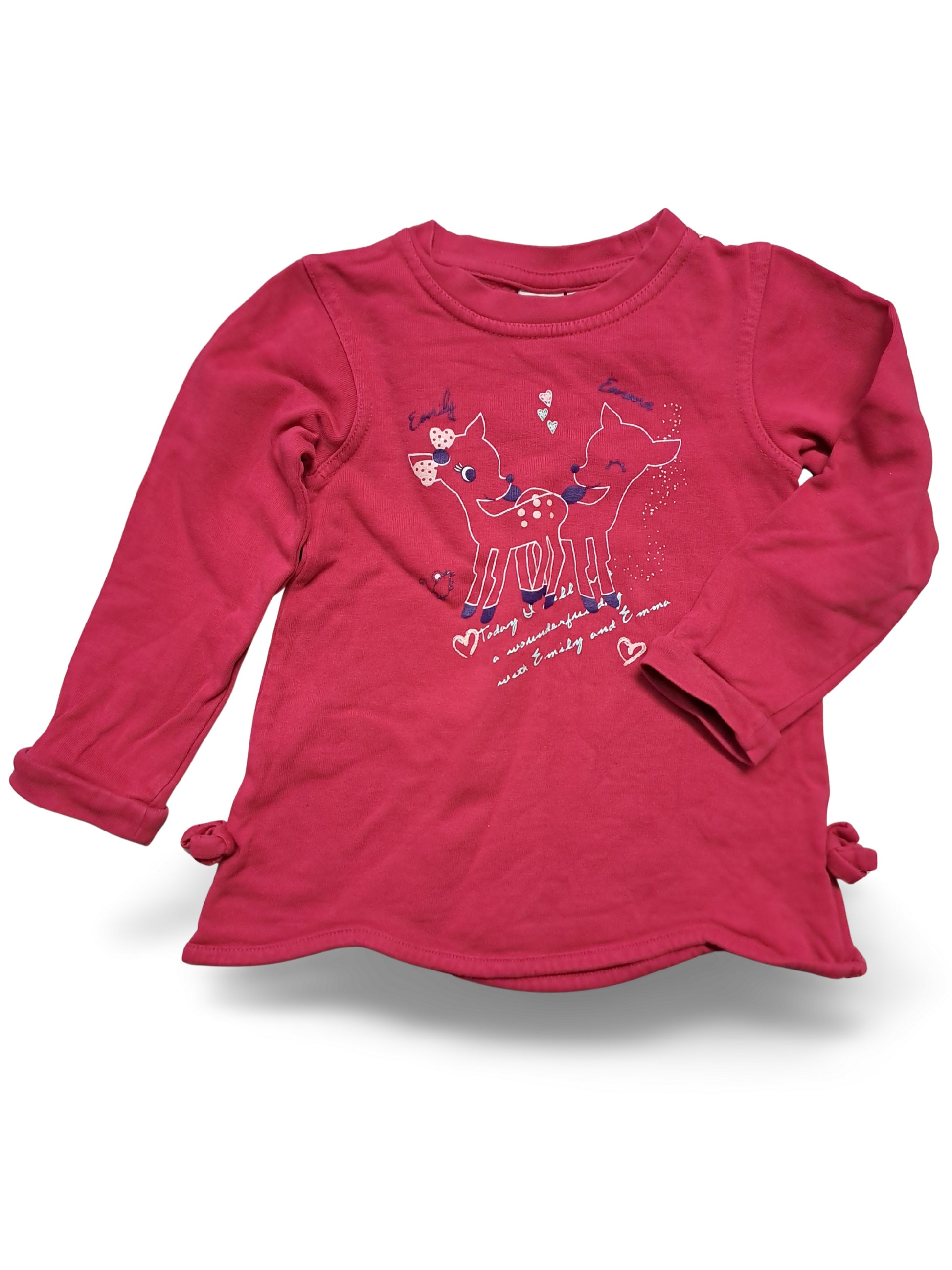 Pinkes Langarmshirt mit zwei niedlichen Rehen, Herzchen-Details und dezenten Glitzerakzenten für einen verspielten Look. Der Rundhalsausschnitt und seitliche Knoten setzen charmante Akzente, während weiches Baumwolljersey für angenehmen Tragekomfort sorgt.
