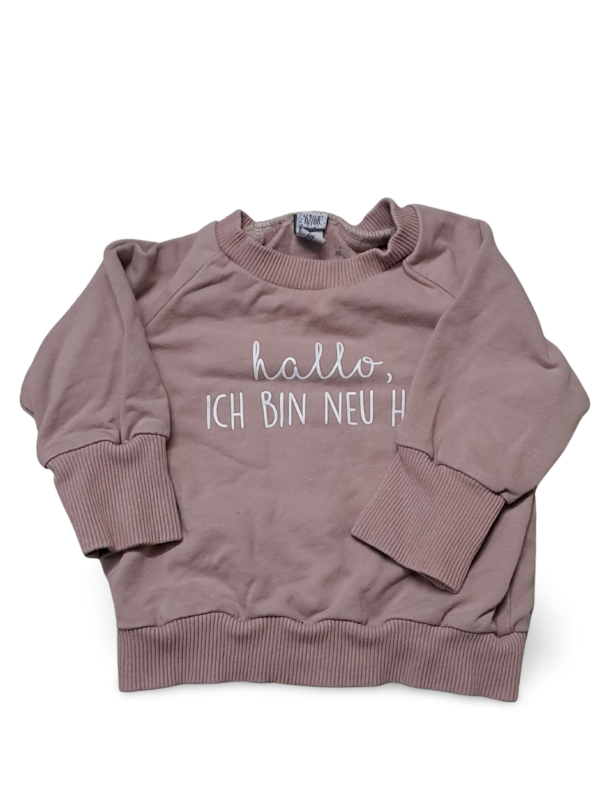 Süsses altrosa Kinder-Sweatshirt mit Rundhalsausschnitt und breiten Rippbündchen an Ärmeln und Saum. Auf der Vorderseite befindet sich ein weisser Schriftzug mit Begrüssung, der dem Teil einen charmanten Look verleiht.