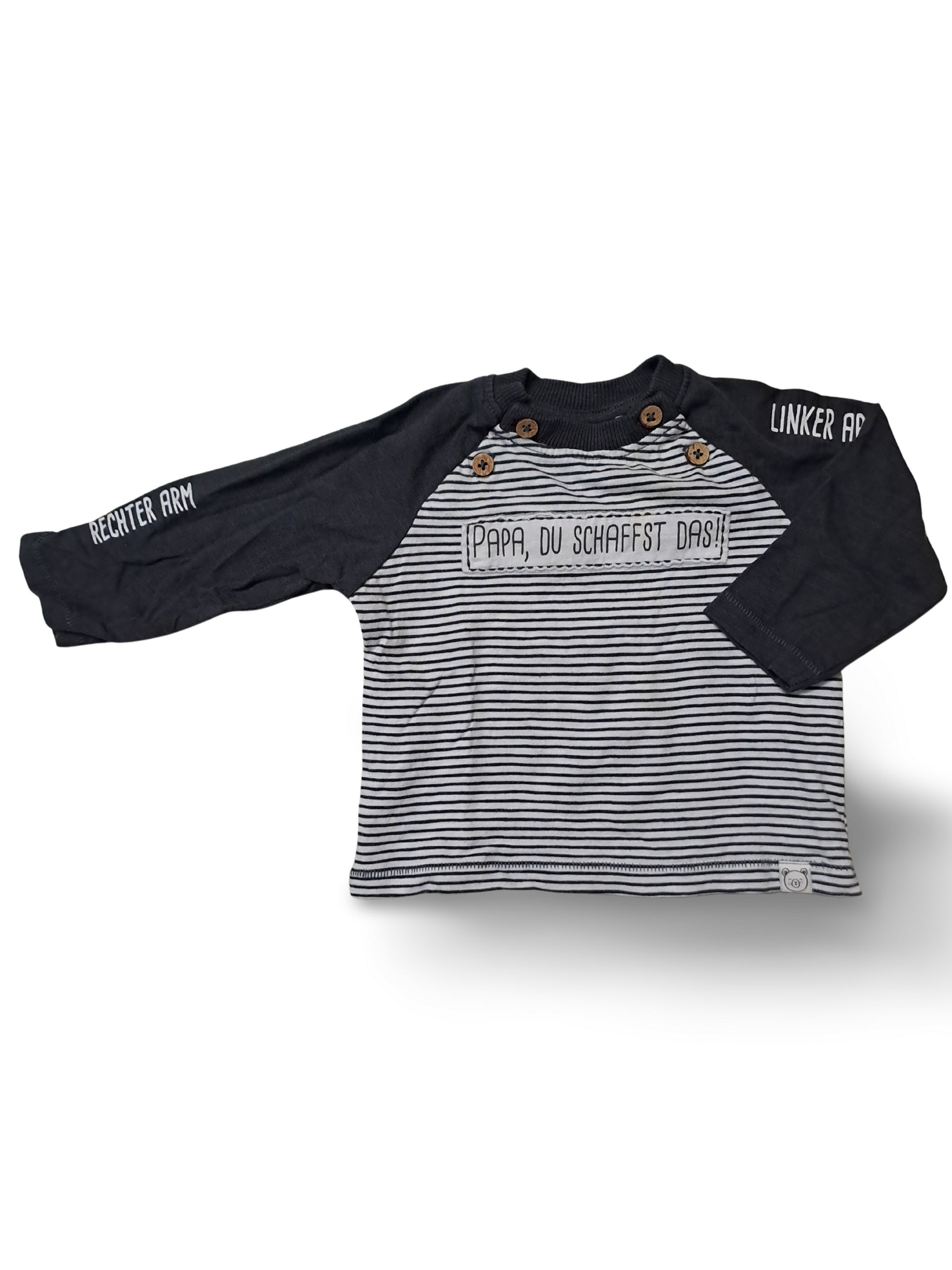 Dunkelblaue Ärmel treffen auf ein weiss-dunkelblau gestreiftes Vorderteil: süsses Langarmshirt fürs Baby mit dekorativen Holzknöpfen an der Schulter und dem Aufdruck "Papa, du schaffst das!". Die kontrastierenden Ärmel sind dezent beschriftet und das vielseitig kombinierbare Design passt zu vielen Alltagslooks.