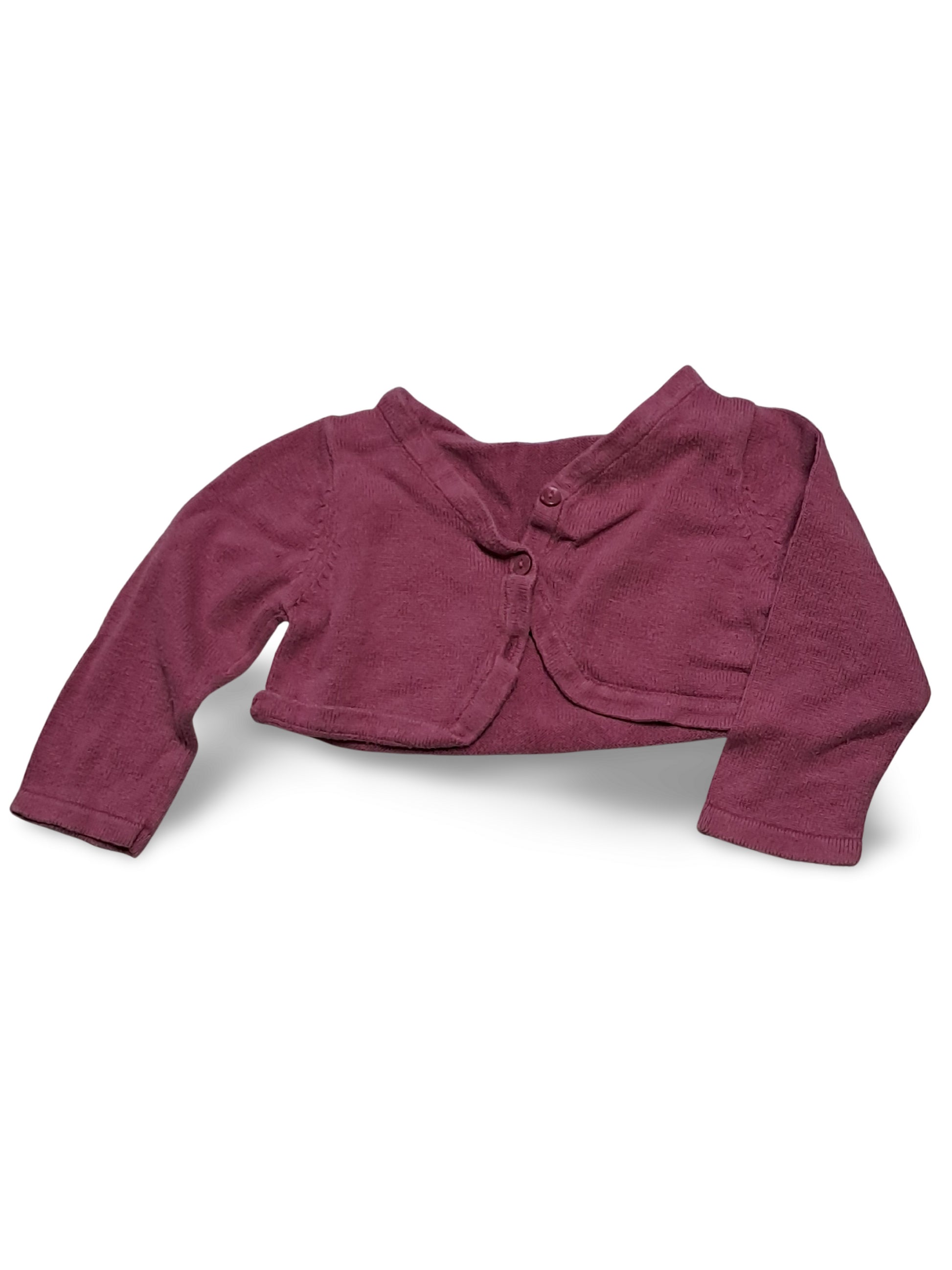 Kurz geschnittenes Bolero-Jäckchen in warmem Beerenton mit langen Ärmeln und zwei Knöpfen. Vielseitig kombinierbar über Kleider oder Shirts und ideal als leichtes Zusatzstück. Schlichte, zeitlose Optik mit feiner Strickstruktur.