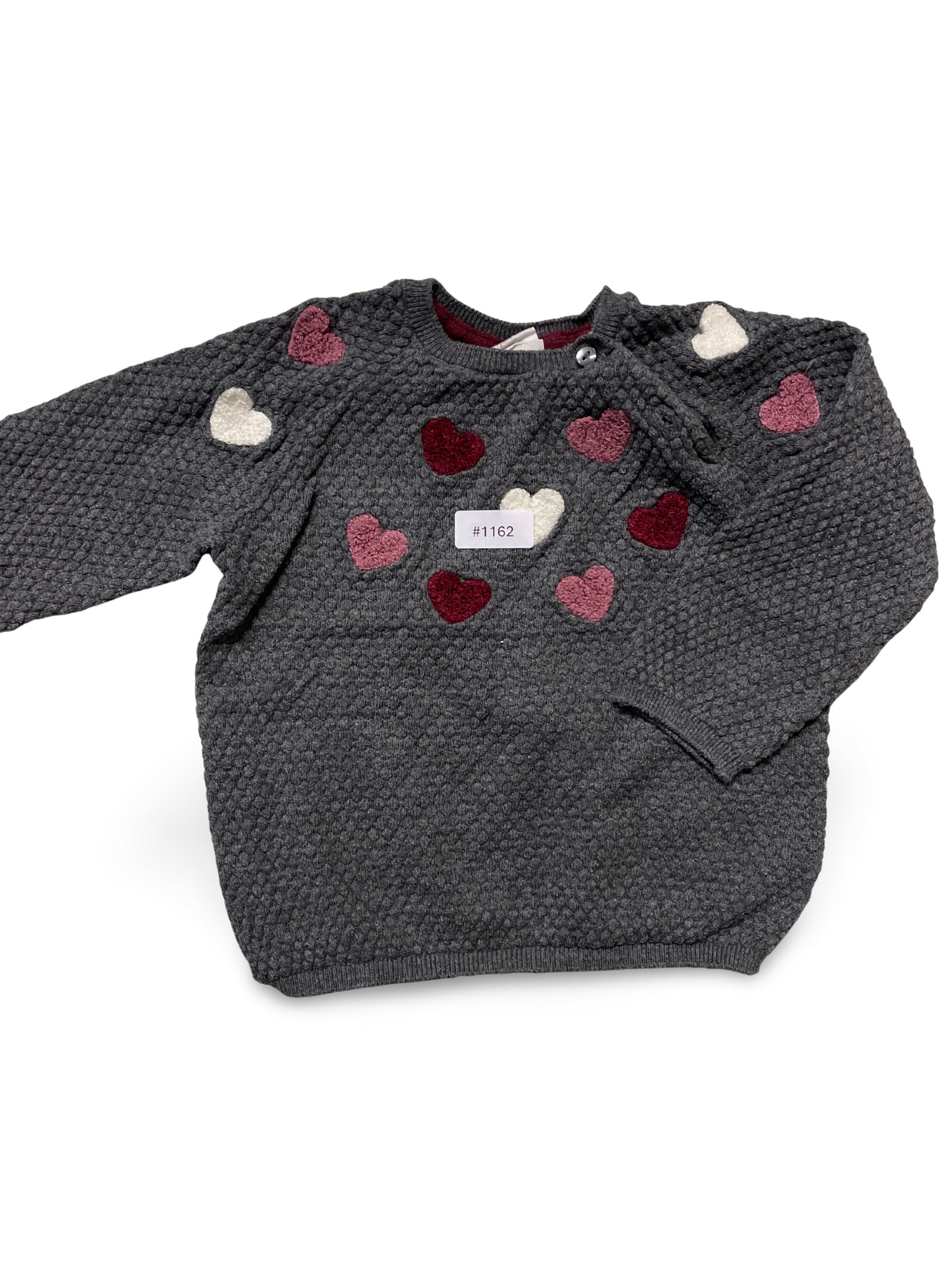 Gemütlicher grauer Pullover mit bunten Herz-Applikationen.