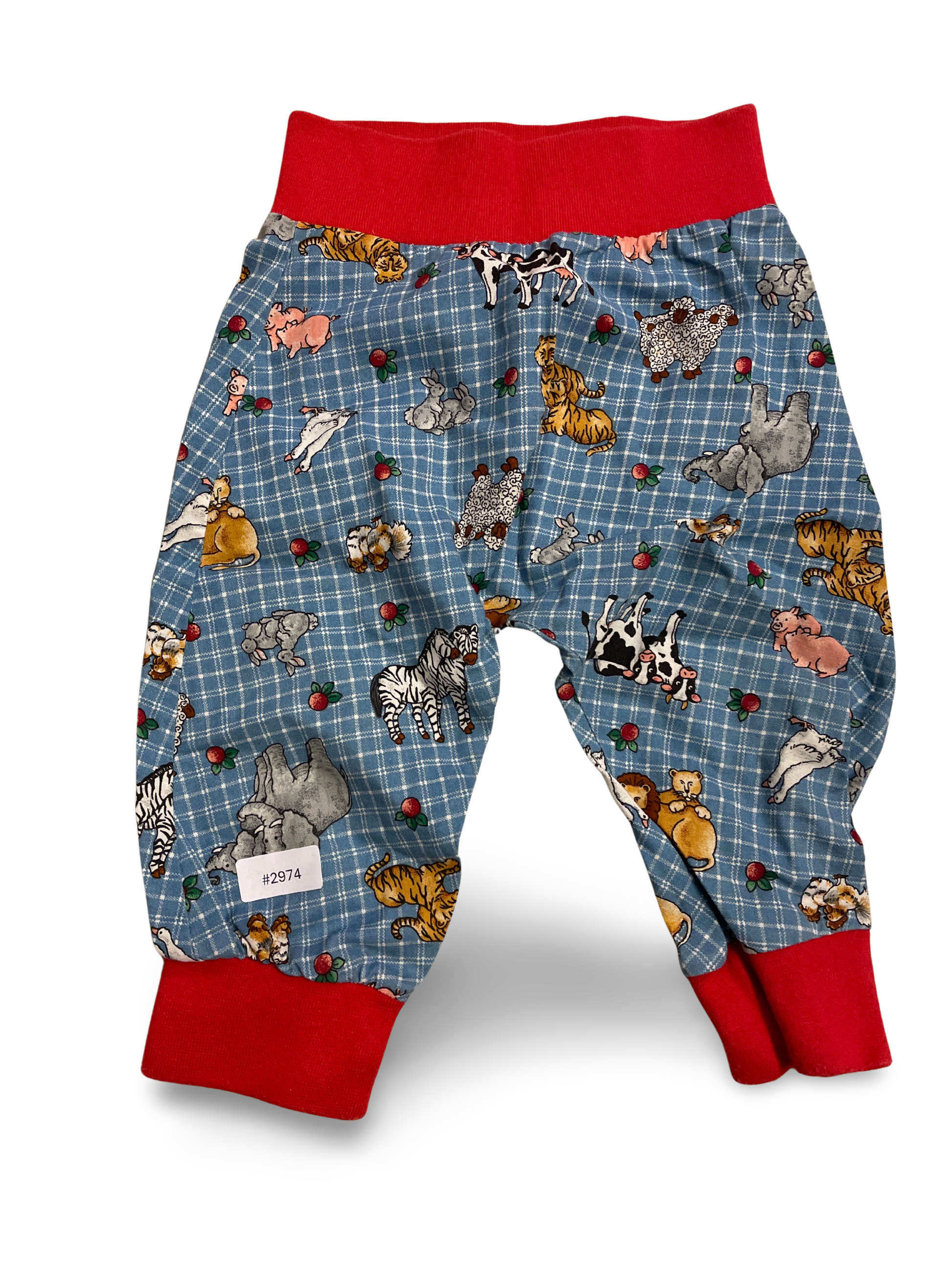 Leichte, verspielte Kinderhose mit buntem Tiermotiv auf blauem Karo und kontrastierenden roten Bündchen. Der dehnbare Bund und die anschmiegsamen Beinsaume bieten viel Bewegungsfreiheit beim Spielen und Entdecken.