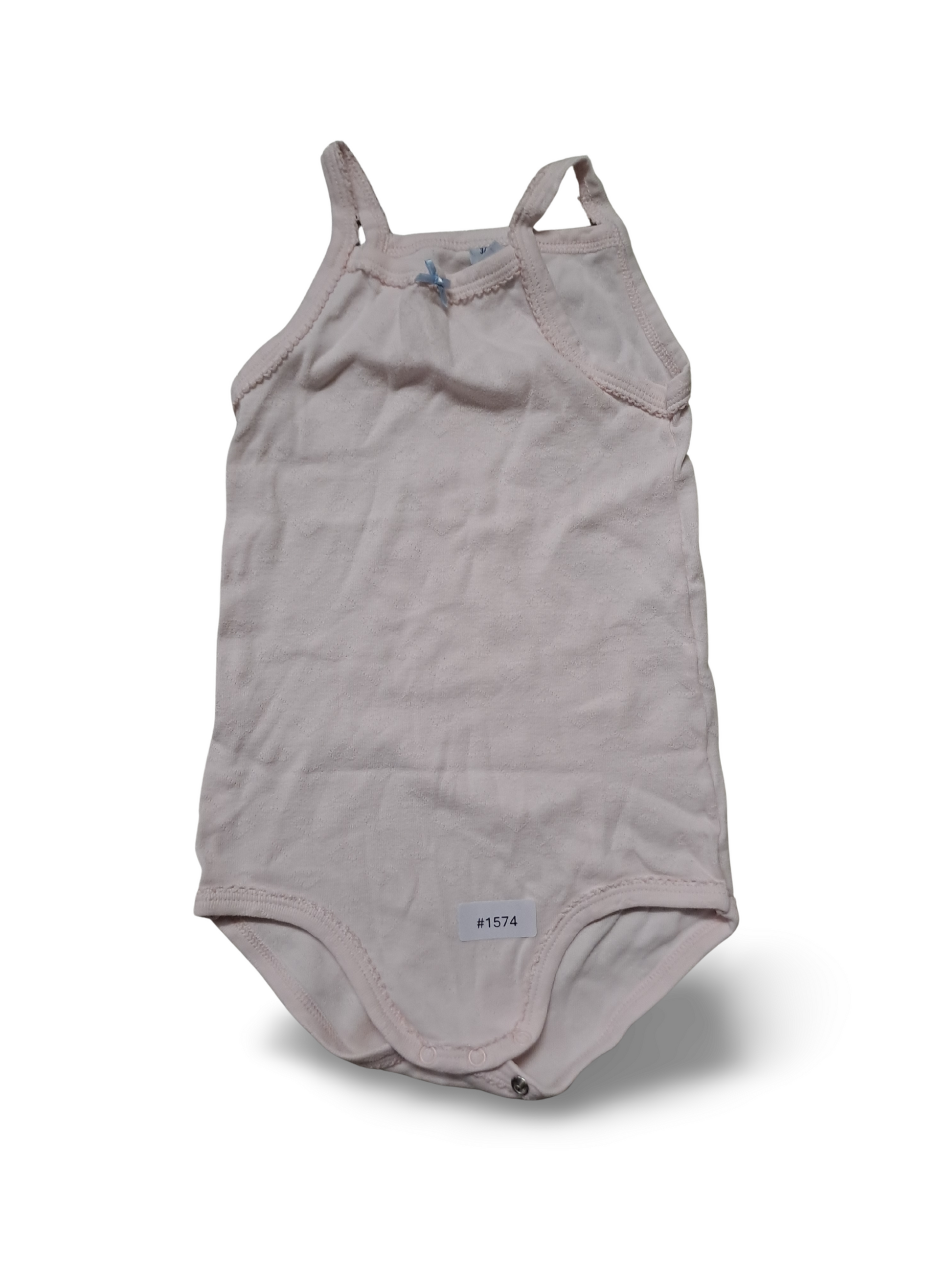 Ärmelloser Babybody mit schmalen Trägern, kleinem Zierknoten am Ausschnitt und Druckknopfverschluss im Schritt, einfarbig rosa