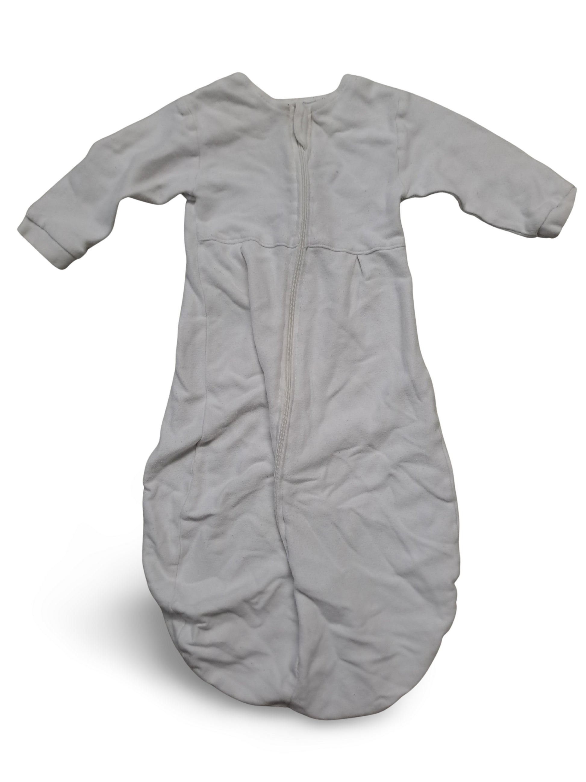 Schlichter weisser Baby-Schlafsack mit langen Ärmeln und durchgehendem Reissverschluss für einfaches An- und Ausziehen. Das runde Fussende bietet viel Bewegungsfreiheit beim Schlafen. Ideal für gemütliche Nächte zuhause.
