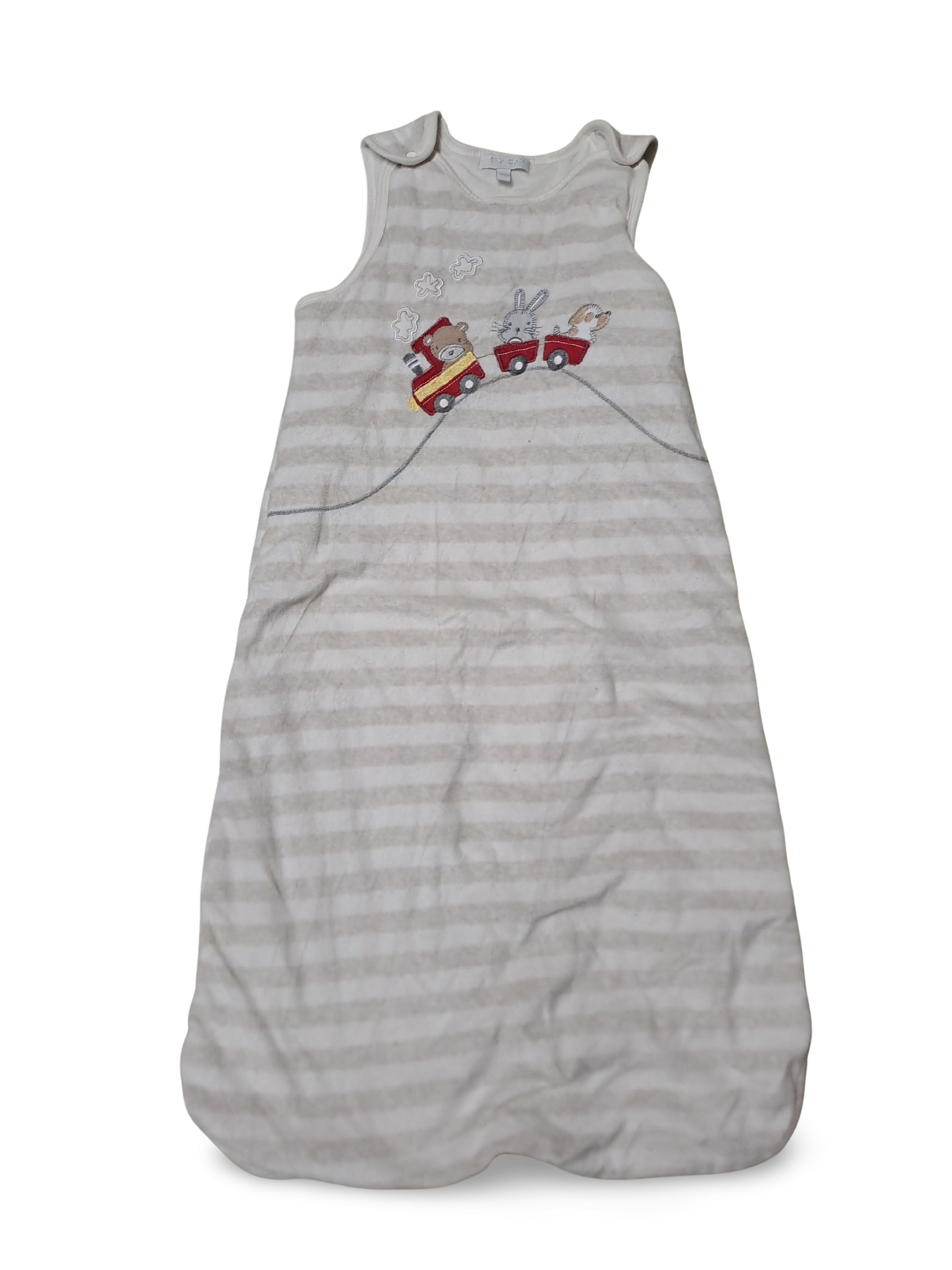Babyschlafsack mit dezenten beige-weissen Streifen und einer süssen Zug-Applikation mit Tiermotiven. Mit praktischen Druckknöpfen an den Schultern für einfaches An- und Ausziehen.