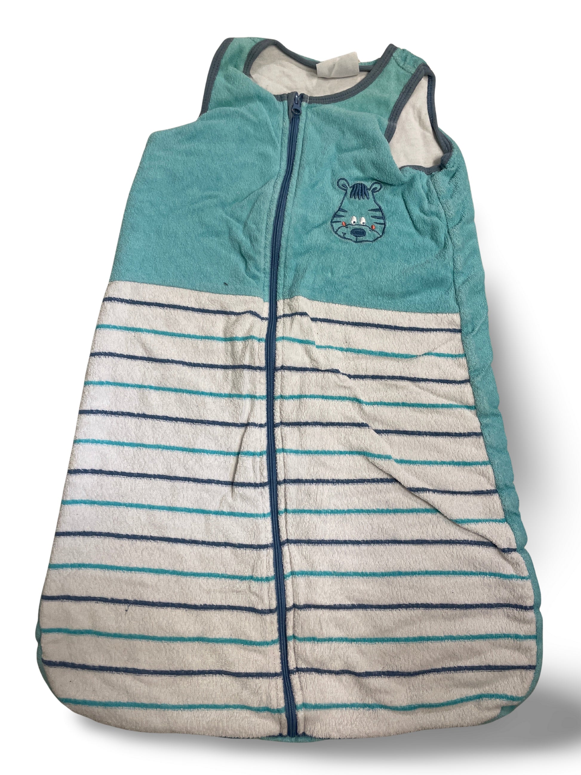 Praktischer Baby-Schlafsack in Türkis mit weiss-blau-türkisen Streifen und durchgehendem Reissverschluss für einfaches An- und Ausziehen. Auf der Vorderseite ziert ein süsses, gesticktes Tiermotiv den Schlafsack. Ideal für gemütliche Nächte zuhause oder unterwegs.