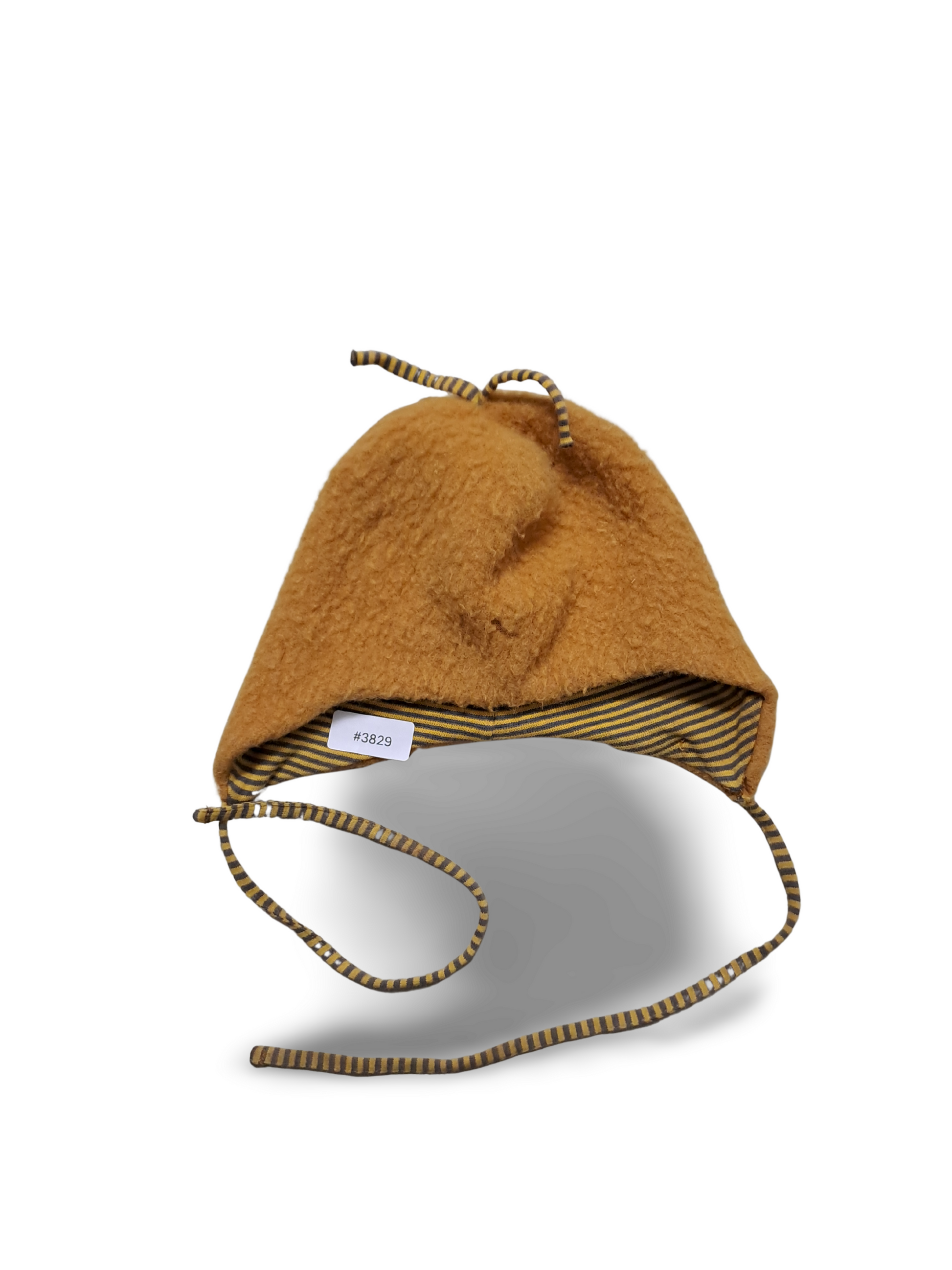 Senfgelbe Fleece-Mütze mit gestreiftem Futter und Kinnbändern - Gr. 80