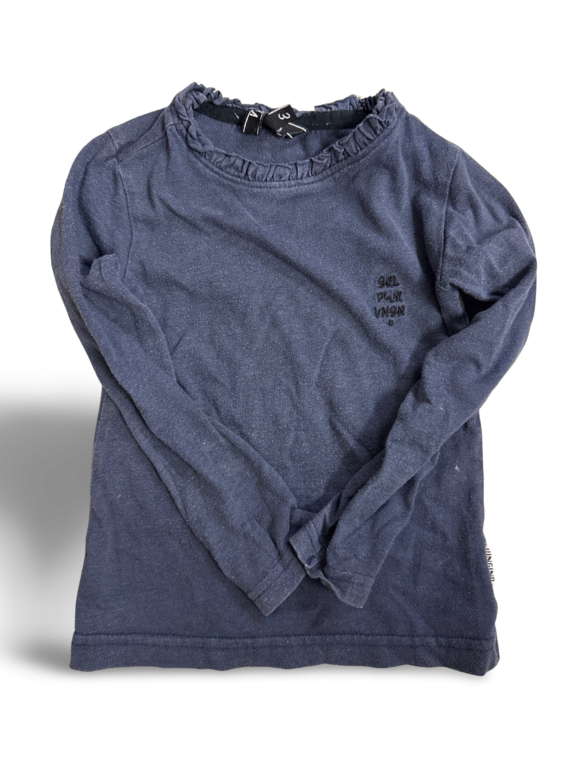 Schlichtes dunkelblaues Langarmshirt mit dezentem Rüschkragen und kleinem Stickdetail auf der Brust. Vielseitiges Basic, das sich gut zu Jeans oder Rock kombinieren laesst.