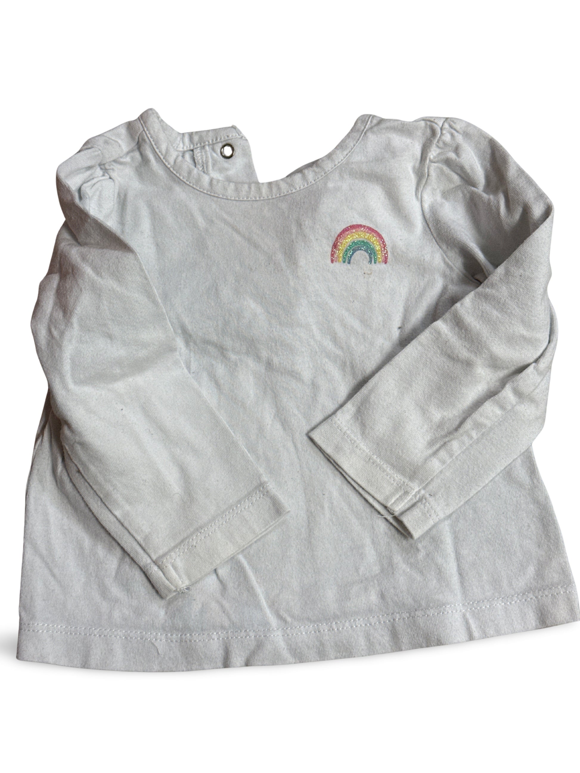 Hellgraues Langarmshirt mit dezentem, glitzerndem Regenbogenmotiv auf der Brust. Runder Ausschnitt und praktischer Druckknopf an der Schulter erleichtern das Anziehen. Lockere Passform und vielseitig kombinierbar für den Kinderalltag.