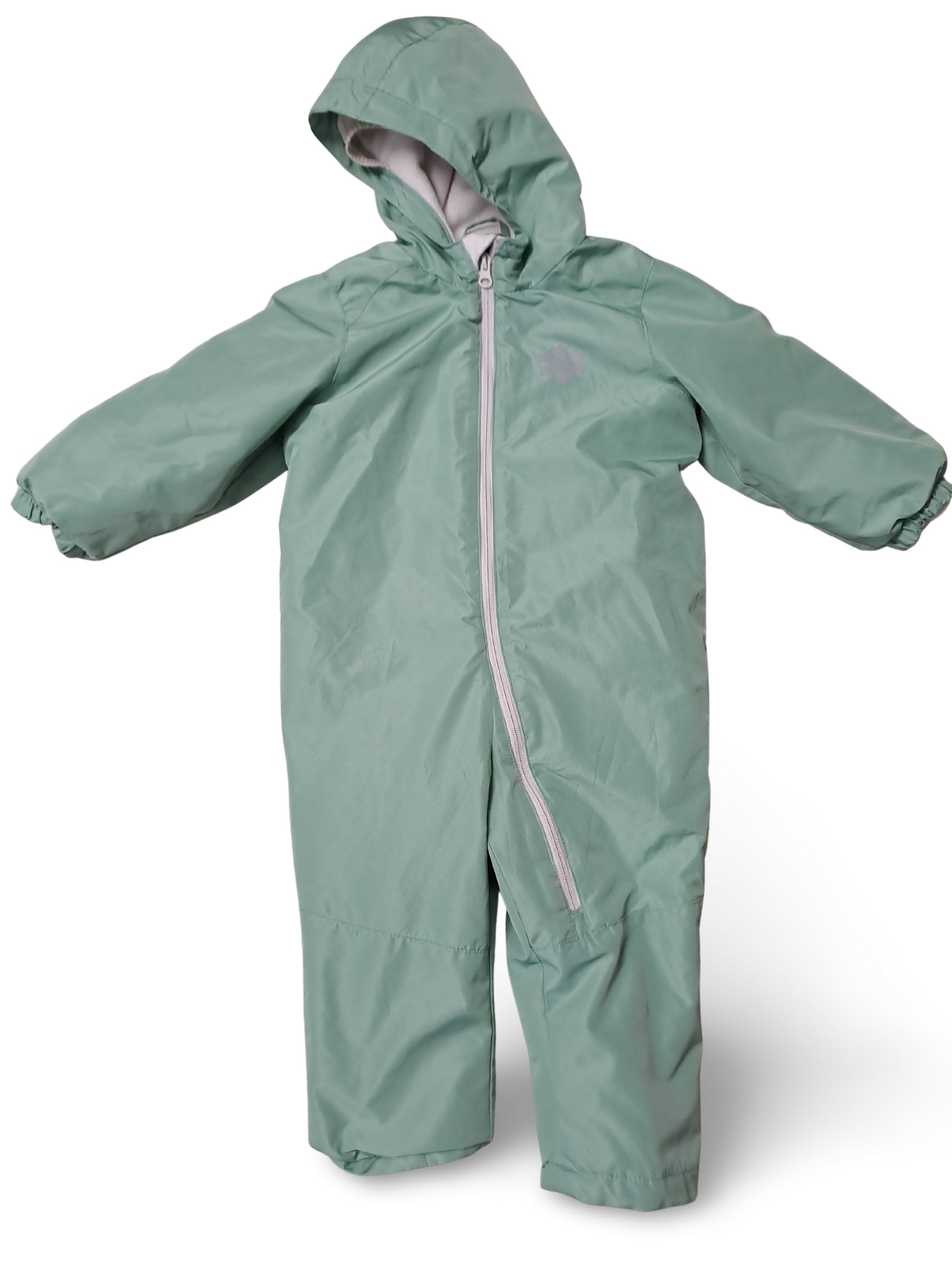 Mintgrüner Overall mit Kapuze und durchgehendem Reissverschluss für unkompliziertes An- und Ausziehen. Aussenstoff ist wasserabweisend und elastische Bündchen an Ärmeln und Beinen sorgen für guten Sitz. Schlichtes, zeitloses Design, das sich vielseitig kombinieren lässt.