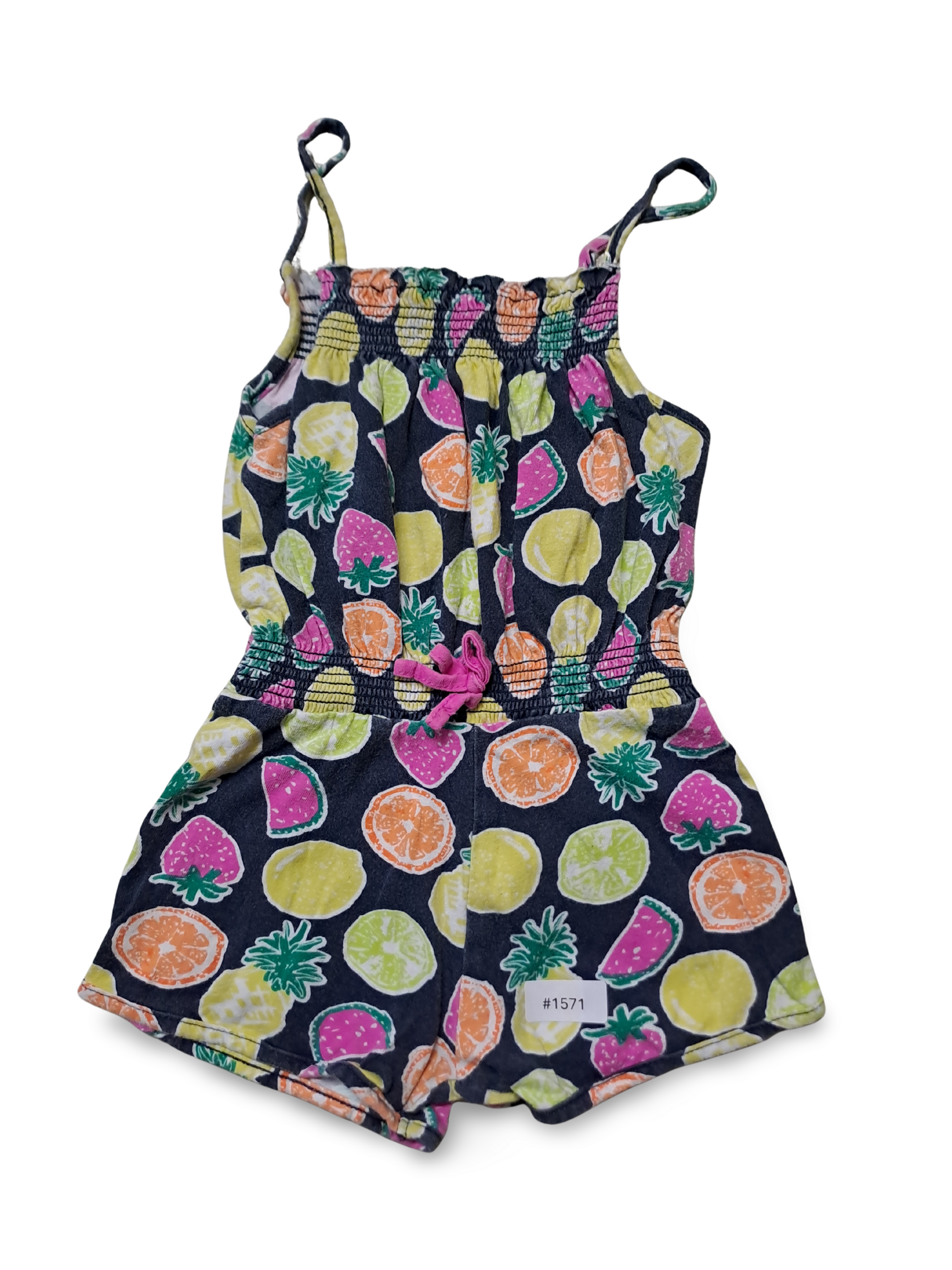 Kurzer Kinderoverall mit Spaghettiträgern und buntem Fruchtmuster, elastischem Bund und Bindeband in der Taille, schön geschnitten mit gerafftem Oberteil.