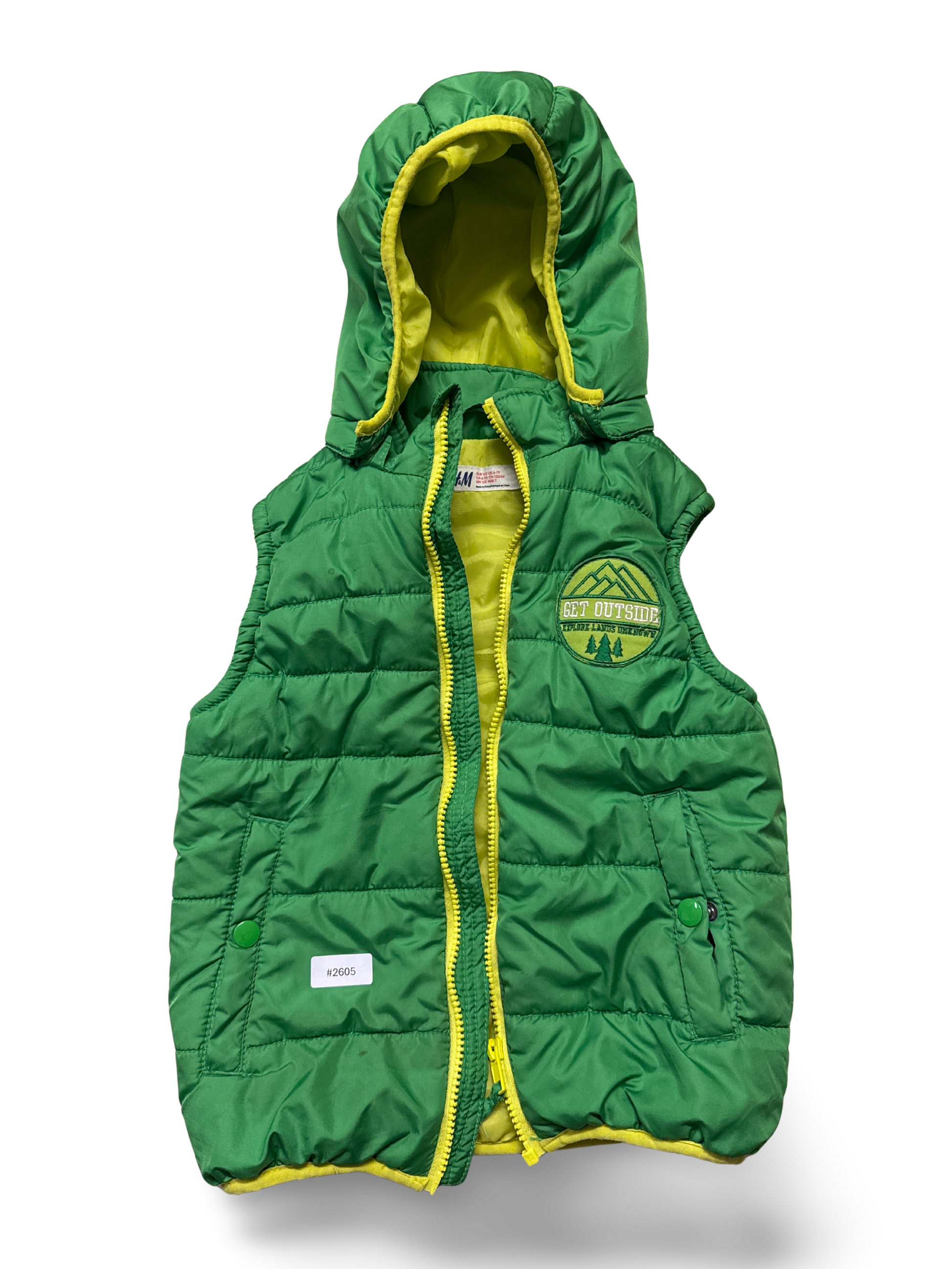 Leichte, froehliche Kinderweste in lebhaftem Grün mit gelbem Innenfutter und Kapuze. Sie begleitet kleine Entdecker bei ihren Abenteuern, bringt sonnige Farbakzente und praktische Taschen fuer Kleinigkeiten. Ein charmantes Berg-Logo rundet das verspielte Design ab.