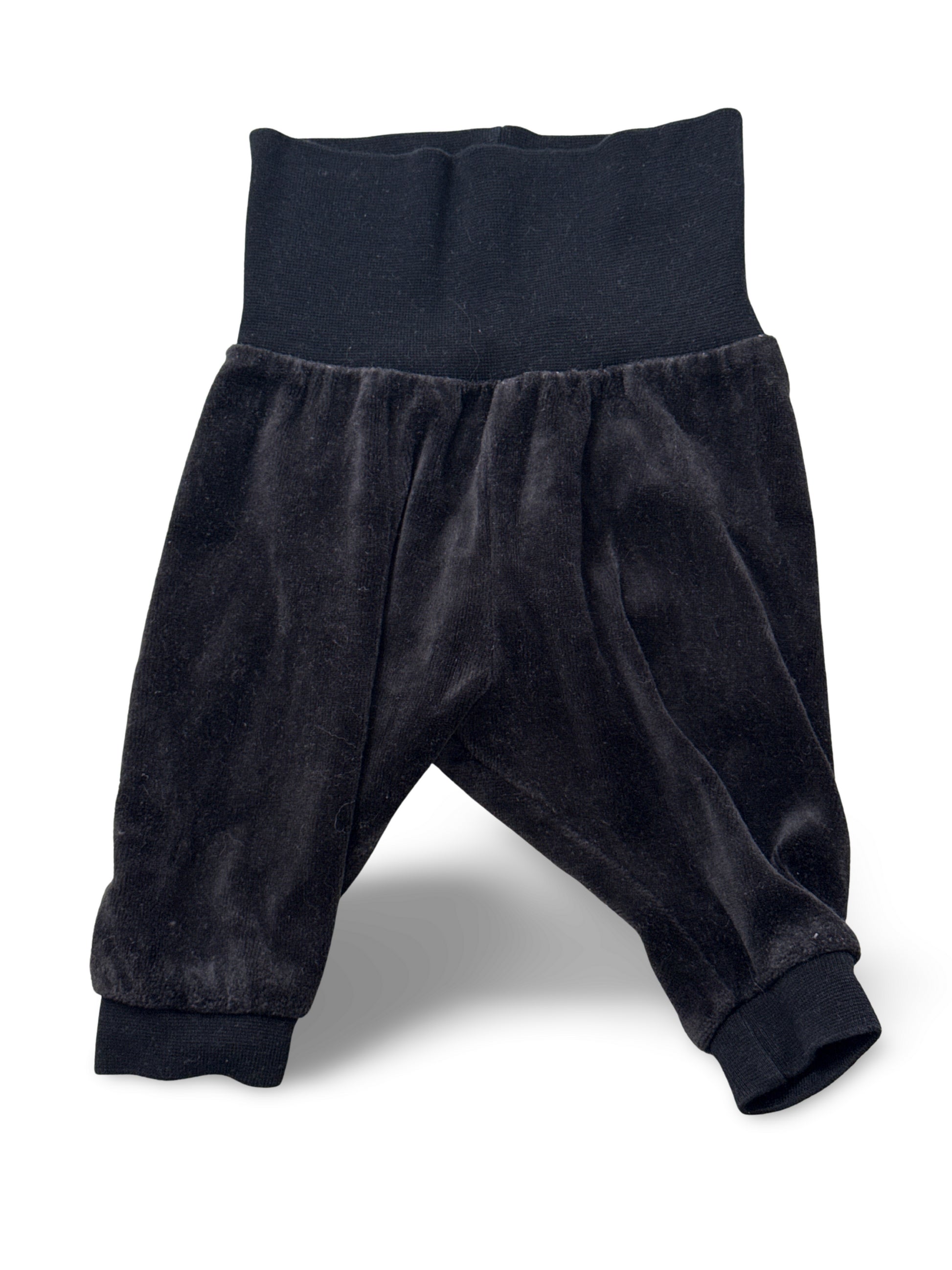 Schwarze Baby-/Kinderhose aus weichem Velours mit hohem, elastischem Bund. Der lockere, leicht tiefe Schnitt bietet viel Bewegungsfreiheit, die abschliessenden Beinbündchen halten warm. Ein gemütliches Basic für den Alltag.