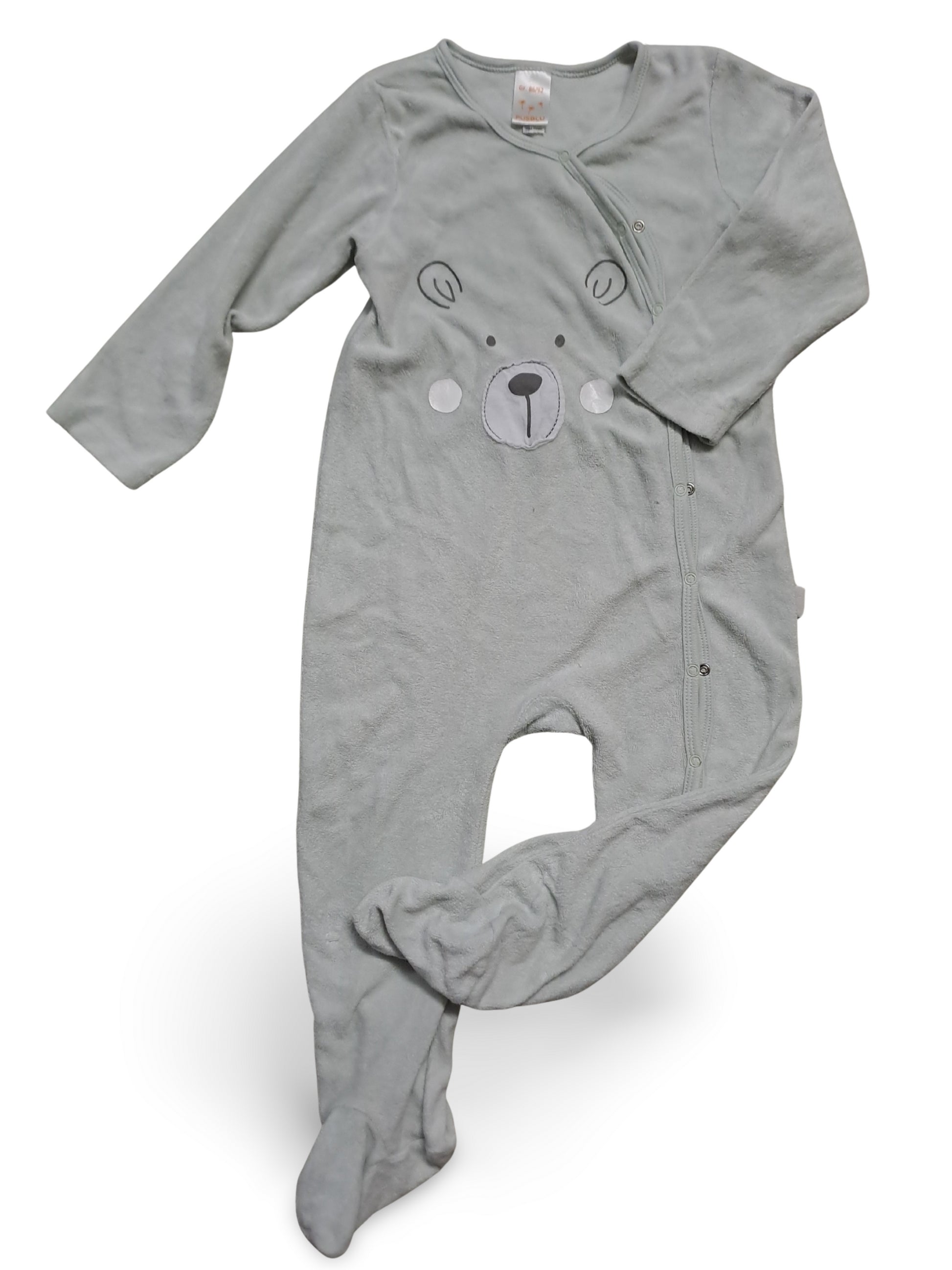Gemütlicher Baby-Schlafanzug mit Fussteil in hellgrau und süssem Bärenmotiv auf der Vorderseite. Mit seitlichem Druckknopfverschluss und langen Ärmeln für einfaches An- und Ausziehen. Weicher Fleece-Stoff sorgt für angenehme Wärme.