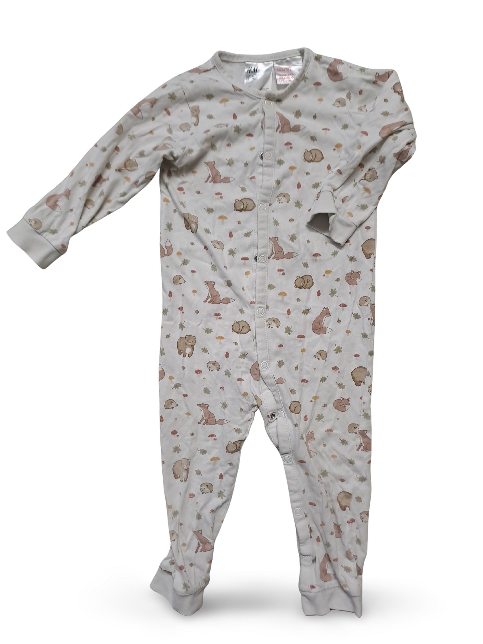 Ein einteiliger, langärmliger Strampler in hellem Creme mit praktischer Druckknopfleiste vorne. Das zarte Allover-Print zeigt Füchse, Bären, Igel und Pilze in warmen Pastelltönen und verleiht einen gemütlichen, naturinspirierten Look.