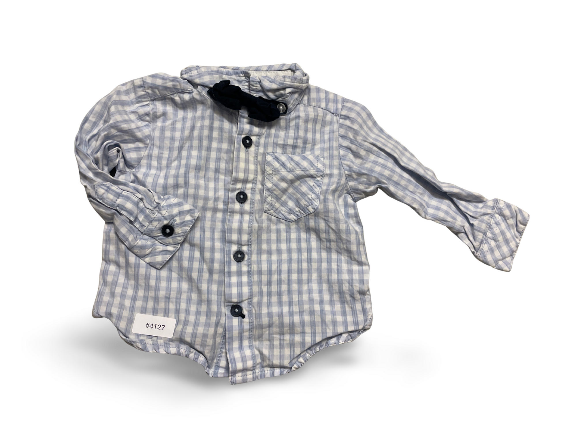 Süsses Baby-Body im Hemdenstil mit zartem blau-weissen Karo, dekorativem dunklem Schleifchen am Kragen und praktischer Brusttasche. Sanfter Schnitt für Bewegungsfreiheit und schöne Kombinationen für festliche und alltägliche Momente.