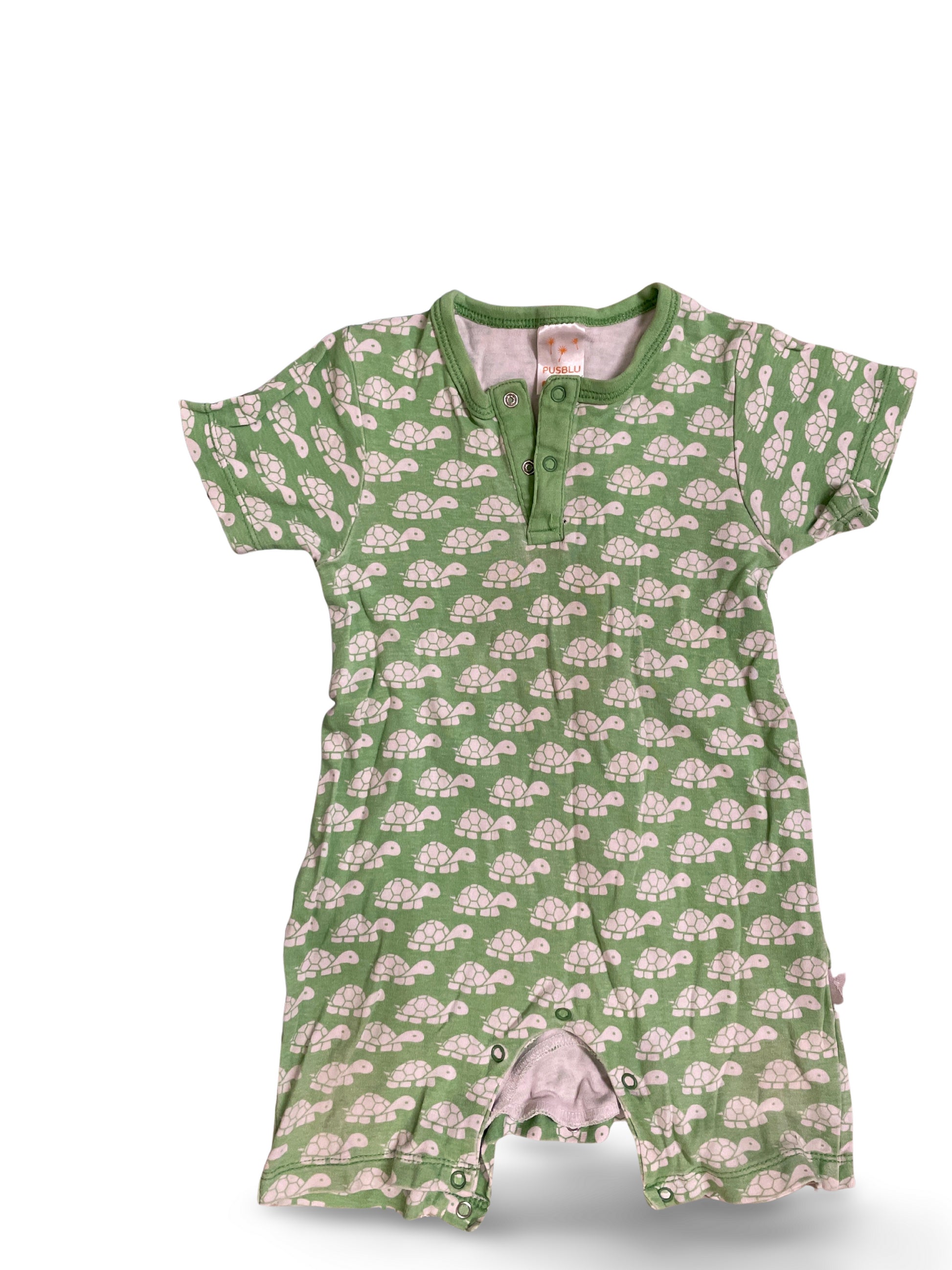 Grüner Kurzarm-Einteiler mit verspieltem Schildkrötenmuster in weiss. Mit praktischem Druckknopfverschluss vorne und im Schritt für einfaches An- und Ausziehen. Ein gemütliches Alltagsstück für Babys.