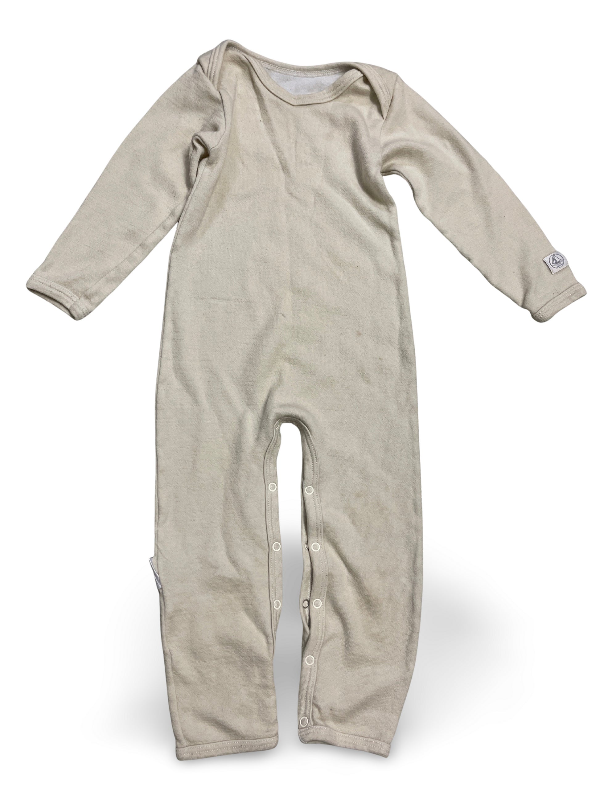 Beigefarbener Babystrampler mit langen Ärmeln und praktischer Druckknopfleiste entlang der Beine. Schlichtes, zeitloses Design in neutraler Farbe, ideal als vielseitiges Basic für den Alltag.