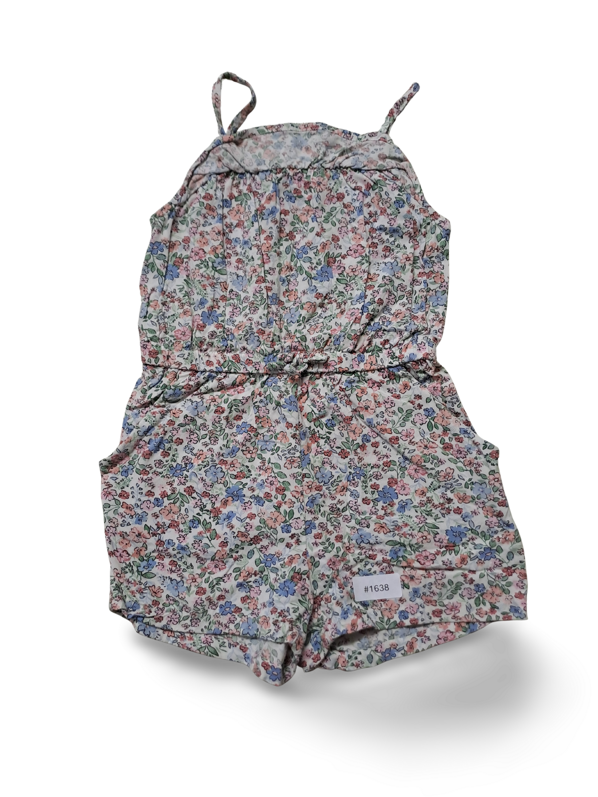 Leichter, ärmelloser Overall fuer Mädchen mit floralem Muster in Pastellfarben, geraffter Taille und kurzen Beinen.