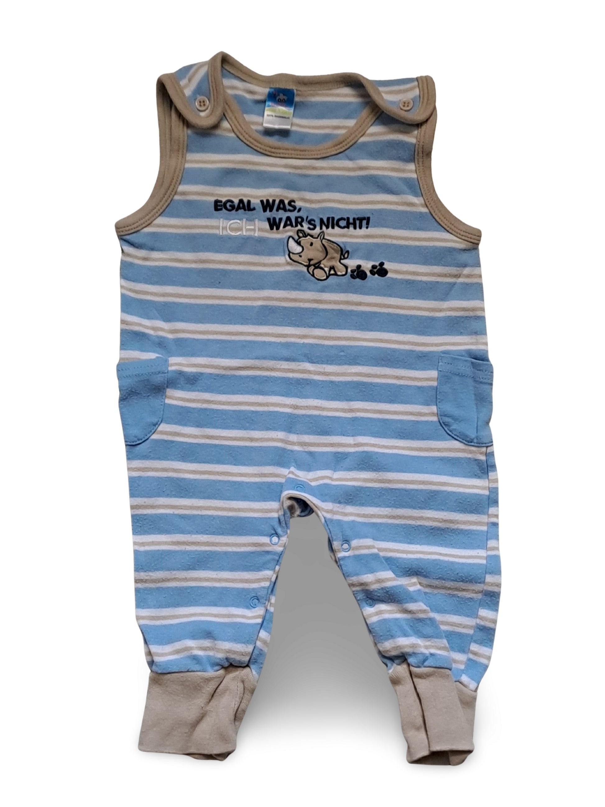 Hellblauer Strampler mit weissen Streifen und süssem Nashorn-Motiv samt frecher Aufschrift "Egal was, ich war's nicht!". Mit praktischen Seitentaschen, Druckknopf-Öffnung im Schritt und umschlagbaren Beinabschlüssen für einfaches An- und Ausziehen.