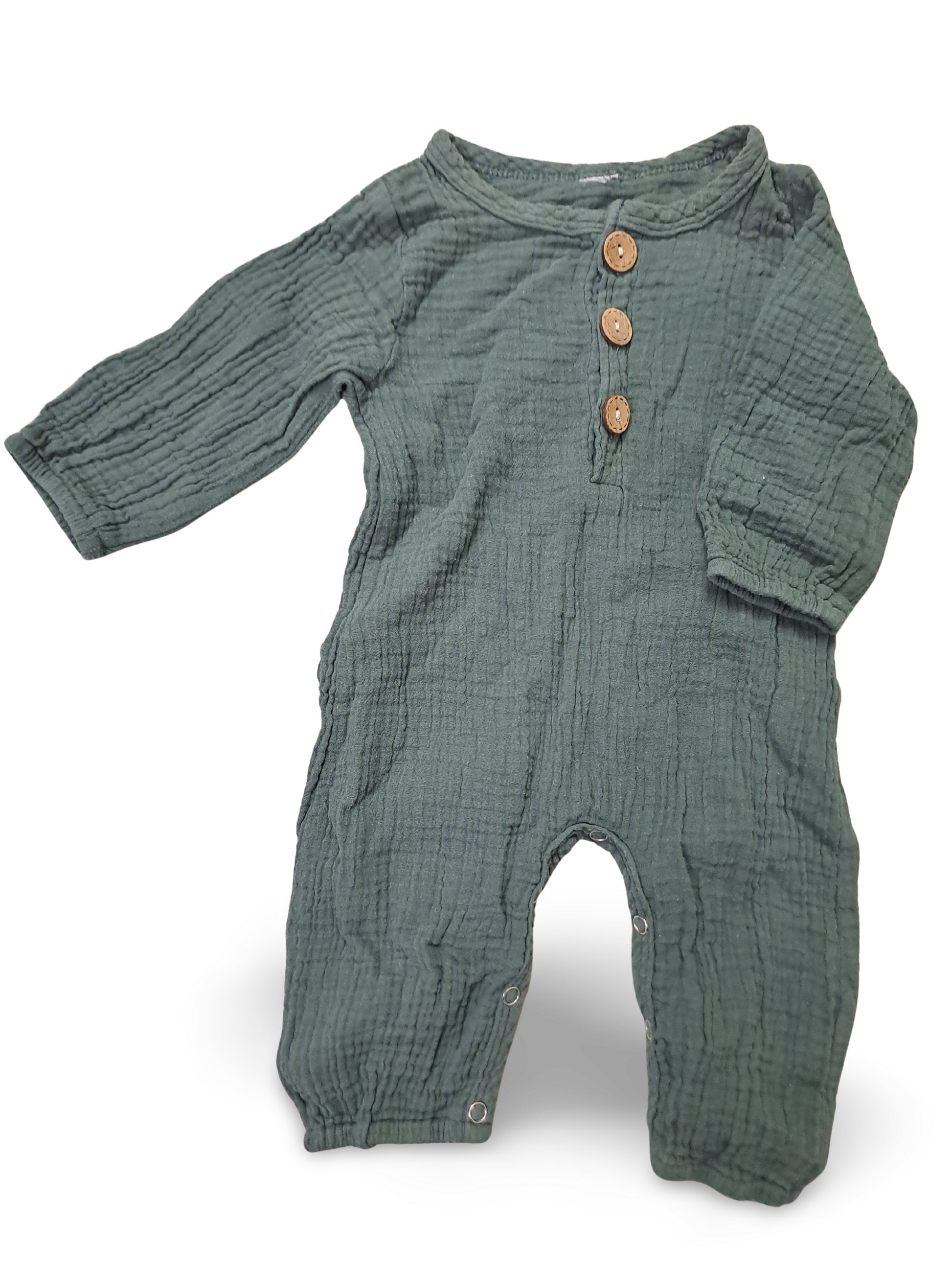 Leichter Baby-Strampler in mittlerem Waldgrün mit strukturierter Musselin-Optik und langen Ärmeln. Drei dekorative Holzknöpfe am Ausschnitt und praktische Druckknöpfe im Schritt machen das An- und Ausziehen einfach. Schlichtes, zeitloses Design für den Alltag.