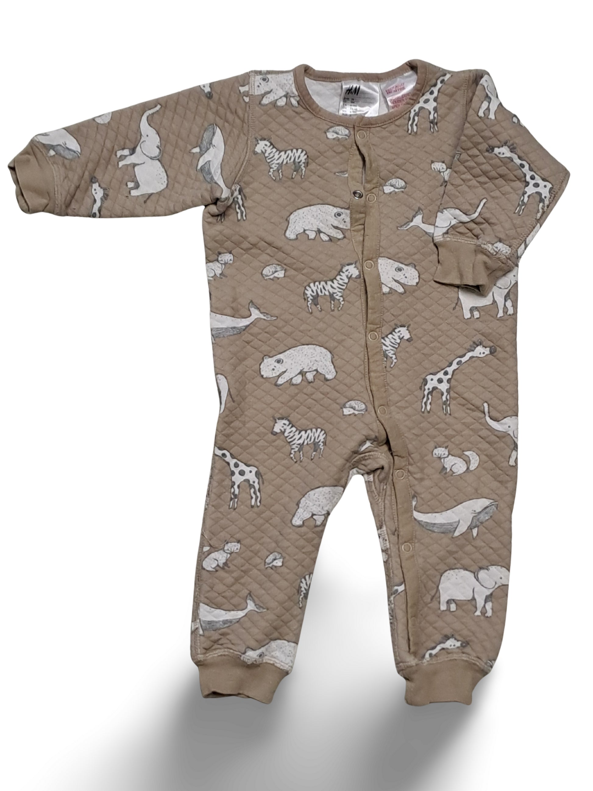 Gesteppter Baby-Overall in warmem Beige mit niedlichem Tierprint (Giraffen, Elefanten, Wale, Zebras). Praktische Druckknopfleiste vorne und an den Beinen für einfaches An- und Ausziehen. Weiches, wärmendes Material – ideal für kuschelige Tage.